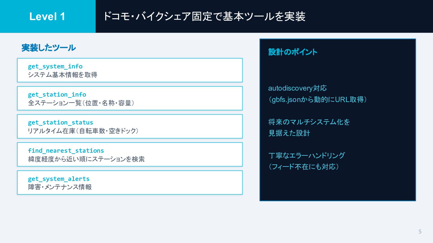 Level 1 ドコモ・バイクシェア固定で基本ツールを実装 実装したツール get_system_info システム基本情報を取得 get_station_info 全ステーション一覧(位置・名称・容量) get_station_status リアルタイム在庫(自転車数・空きドック)