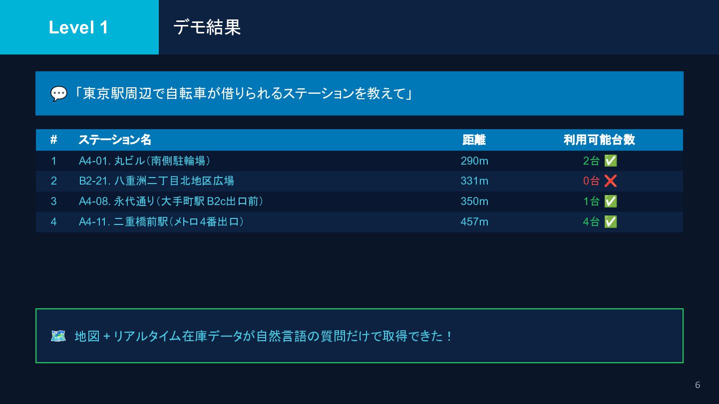 Level 1 デモ結果 💬 「東京駅周辺で自転車が借りられるステーションを教えて」 # ステーション名 距離 利用可能台数 1