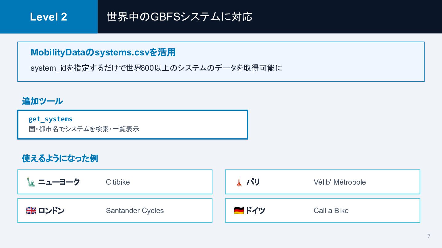 Level 2 世界中のGBFSシステムに対応 MobilityDataのsystems.csvを活用 system_idを指定するだけで世界800以上のシステムのデータを取得可能に 追加ツール get_systems 国・都市名でシステムを検索・一覧表示 使えるようになった例 🗽