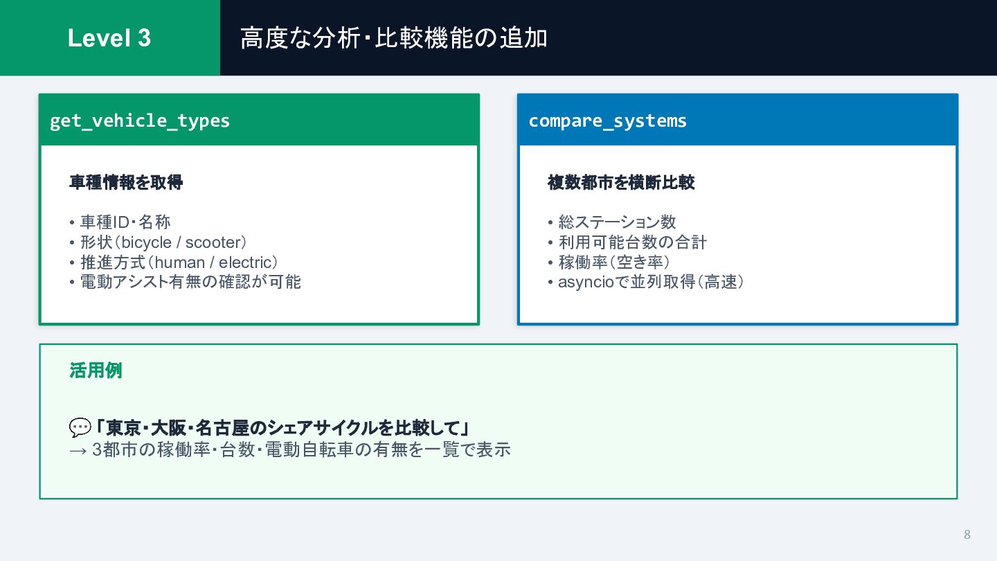 Level 3 高度な分析・比較機能の追加 get_vehicle_types 車種情報を取得 • 車種ID・名称 • 形状(bicycle /