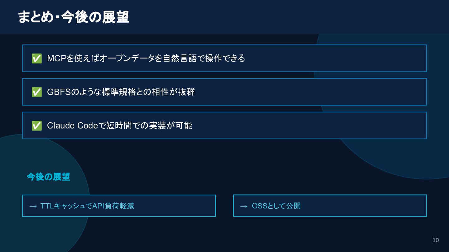 まとめ・今後の展望 ✅ MCPを使えばオープンデータを自然言語で操作できる ✅ GBFSのような標準規格との相性が抜群 ✅ Claude Codeで短時間での実装が可能 今後の展望 →