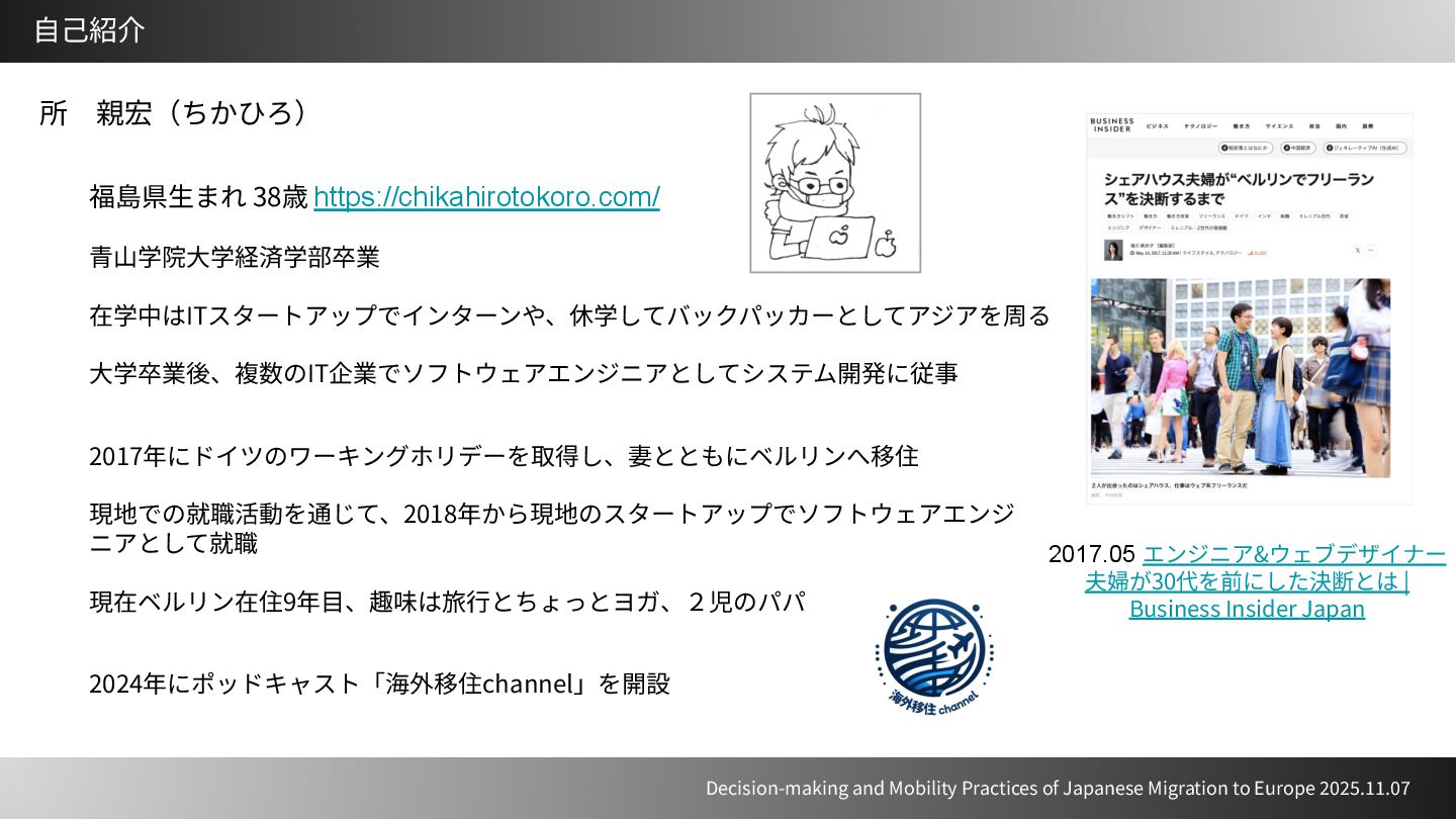 Japanese in Berlin and Interviewing Japanese immigrants through a podcast Chikahiro Tokoro Software Engineer, Podcastor https://chikahirotokoro.com/ Decision-making and Mobility Practices of Japanese Migration to Europe 2025.11.07 at Waseda University