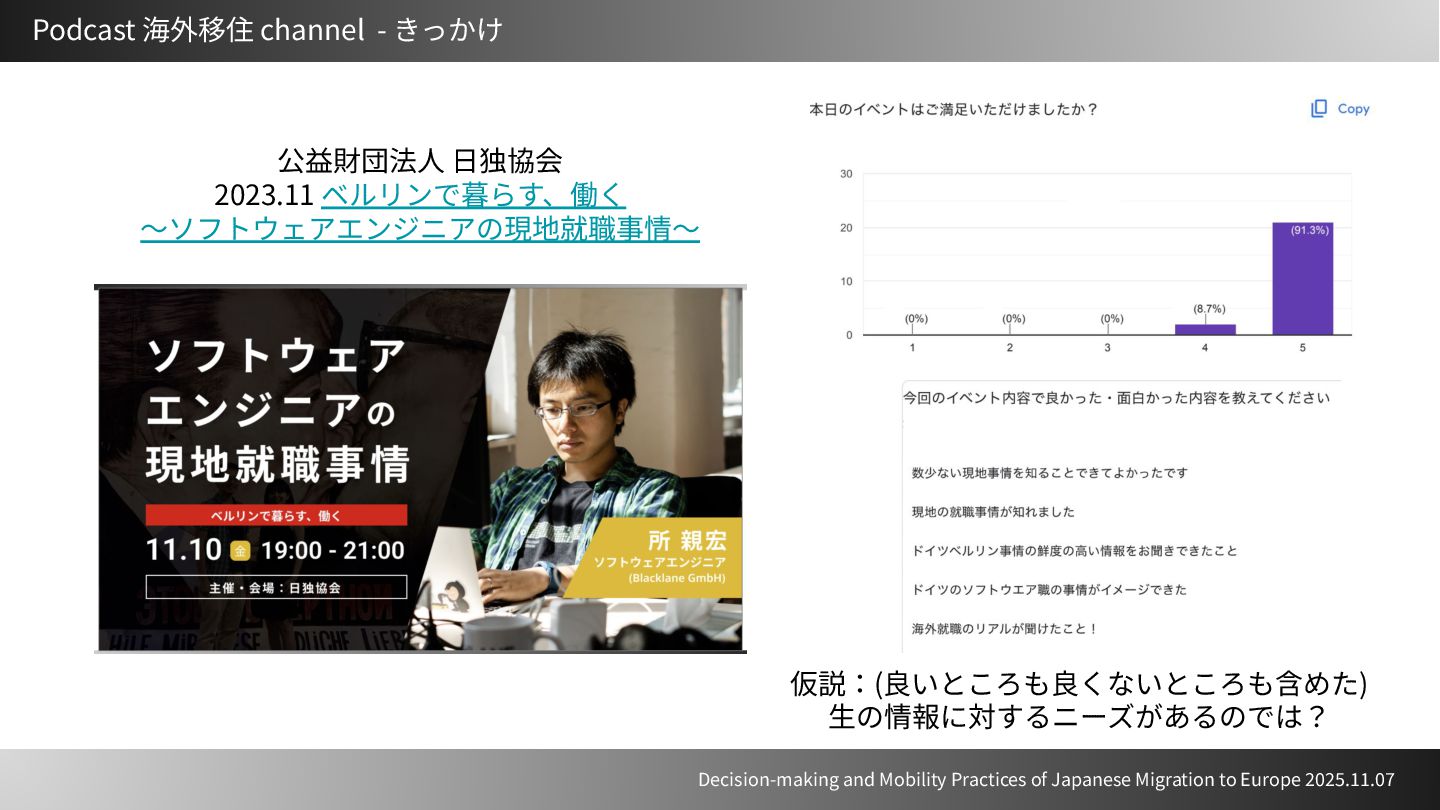 Podcast 海外移住 channel - きっかけ 公益財団法⼈ ⽇独協会 2023.11 ベルリンで暮らす、働く 〜ソフトウェアエンジニアの現地就職事情〜 仮説:(良いところも良くないところも含めた) ⽣の情報に対するニーズがあるのでは?