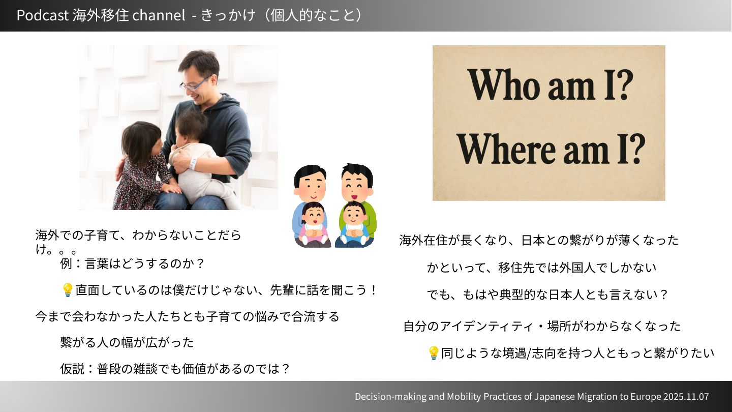 Podcast 海外移住 channel - きっかけ(個⼈的なこと) 海外での⼦育て、わからないことだら け。。。 今まで会わなかった⼈たちとも⼦育ての悩みで合流する 例:⾔葉はどうするのか? 💡直⾯しているのは僕だけじゃない、先輩に話を聞こう! 仮説:普段の雑談でも価値があるのでは? 繋がる⼈の幅が広がった 海外在住が⻑くなり、⽇本との繋がりが薄くなった かといって、移住先では外国⼈でしかない でも、もはや典型的な⽇本⼈とも⾔えない? ⾃分のアイデンティティ‧場所がわからなくなった 💡同じような境遇/志向を持つ⼈ともっと繋がりたい