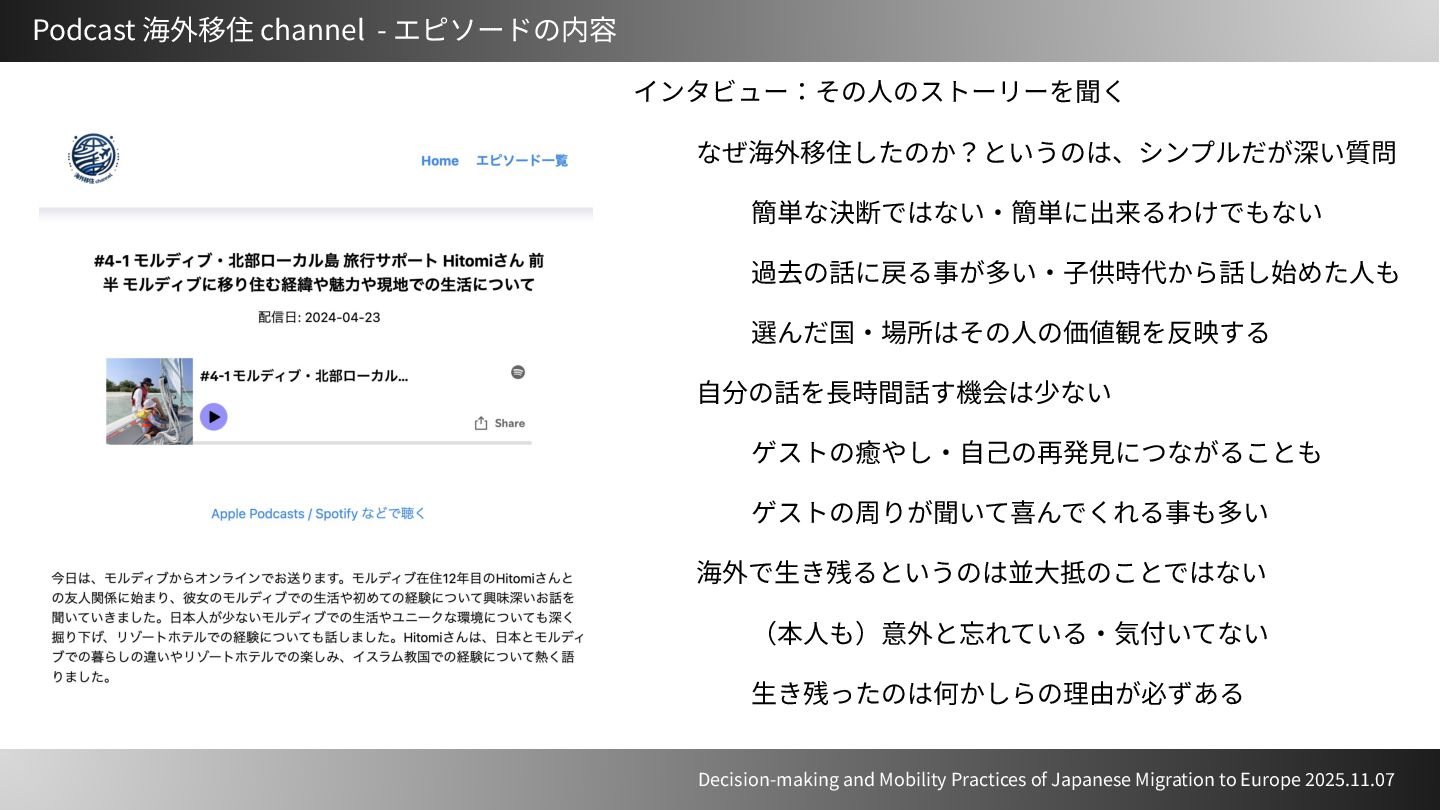 Podcast 海外移住 channel - エピソードの内容 インタビュー:その⼈のストーリーを聞く なぜ海外移住したのか?というのは、シンプルだが深い質問 簡単な決断ではない‧簡単に出来るわけでもない 過去の話に戻る事が多い‧⼦供時代から話し始めた⼈も 選んだ国‧場所はその⼈の価値観を反映する ⾃分の話を⻑時間話す機会は少ない ゲストの癒やし‧⾃⼰の再発⾒につながることも ゲストの周りが聞いて喜んでくれる事も多い 海外で⽣き残るというのは並⼤抵のことではない (本⼈も)意外と忘れている‧気付いてない ⽣き残ったのは何かしらの理由が必ずある