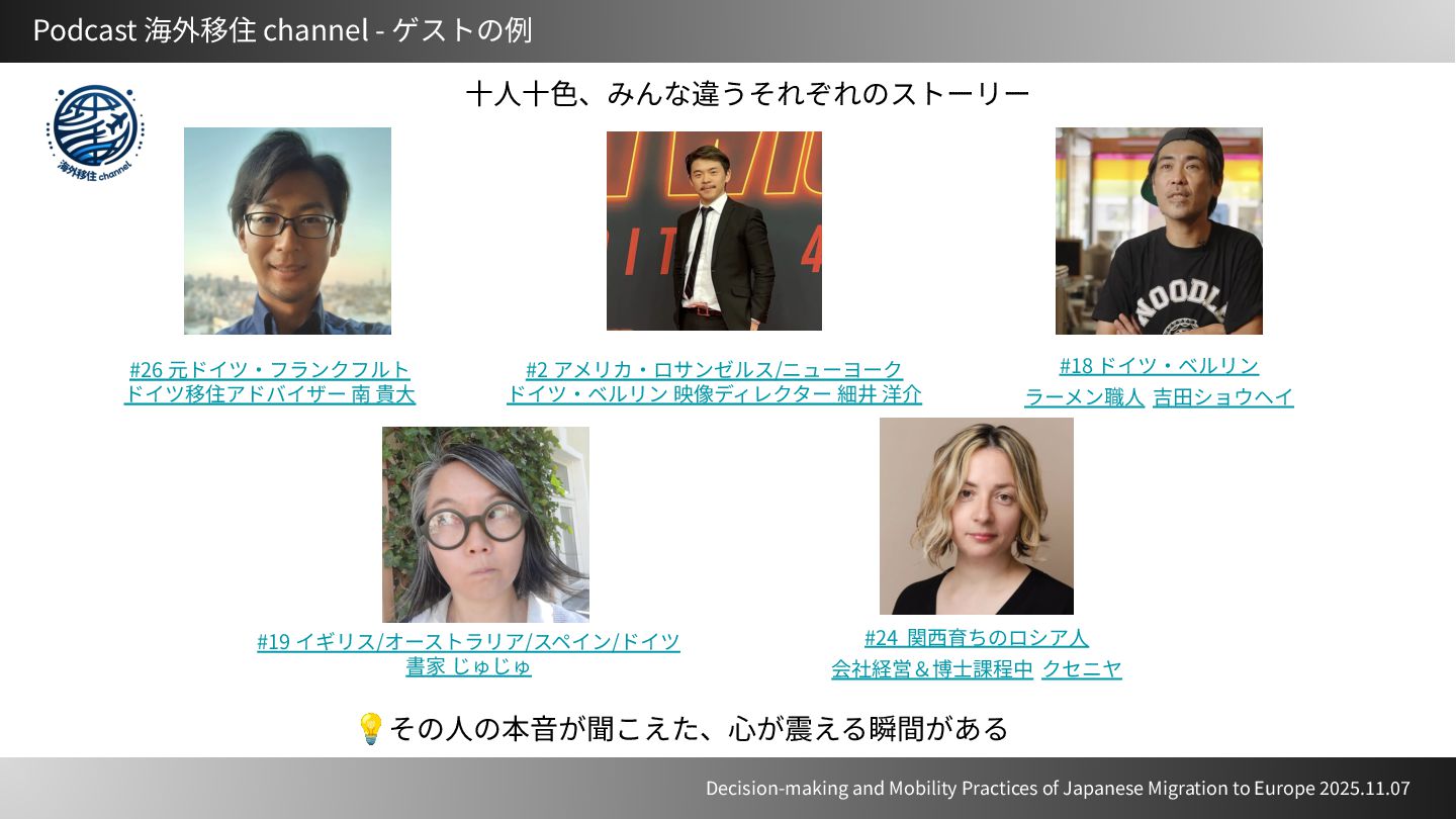 Podcast 海外移住 channel - ゲストの例 💡その⼈の本⾳が聞こえた、⼼が震える瞬間がある ⼗⼈⼗⾊、みんな違うそれぞれのストーリー #24 関⻄育ちのロシア⼈ 会社経営&博⼠課程中 クセニヤ #18 ドイツ‧ベルリン ラーメン職⼈ 吉⽥ショウヘイ #2 アメリカ‧ロサンゼルス/ニューヨーク ドイツ‧ベルリン 映像ディレクター 細井 洋介 #26 元ドイツ‧フランクフルト ドイツ移住アドバイザー 南 貴⼤ #19 イギリス/オーストラリア/スペイン/ドイツ 書家 じゅじゅ