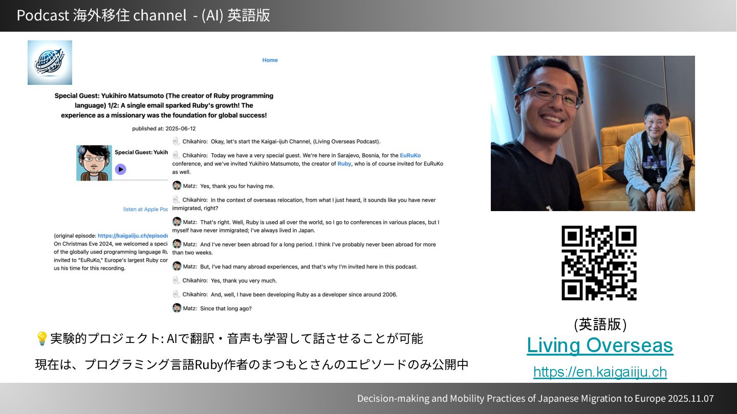 Podcast 海外移住 channel - (AI) 英語版 (英語版) Living Overseas https://en.kaigaiiju.ch 💡実験的プロジェクト: AIで翻訳‧⾳声も学習して話させることが可能 現在は、プログラミング⾔語Ruby作者のまつもとさんのエピソードのみ公開中