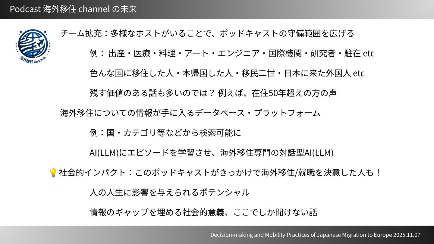 Podcast 海外移住 channel の未来 チーム拡充:多様なホストがいることで、ポッドキャストの守備範囲を広げる 残す価値のある話も多いのでは? 例えば、在住50年超えの⽅の声 💡社会的インパクト:このポッドキャストがきっかけで海外移住/就職を決意した⼈も! ⾊んな国に移住した⼈‧本帰国した⼈‧移⺠⼆世‧⽇本に来た外国⼈ etc 海外移住についての情報が⼿に⼊るデータベース‧プラットフォーム 例:国‧カテゴリ等などから検索可能に AI(LLM)にエピソードを学習させ、海外移住専⾨の対話型AI(LLM) 例: 出産‧医療‧料理‧アート‧エンジニア‧国際機関‧研究者‧駐在 etc ⼈の⼈⽣に影響を与えられるポテンシャル 情報のギャップを埋める社会的意義、ここでしか聞けない話