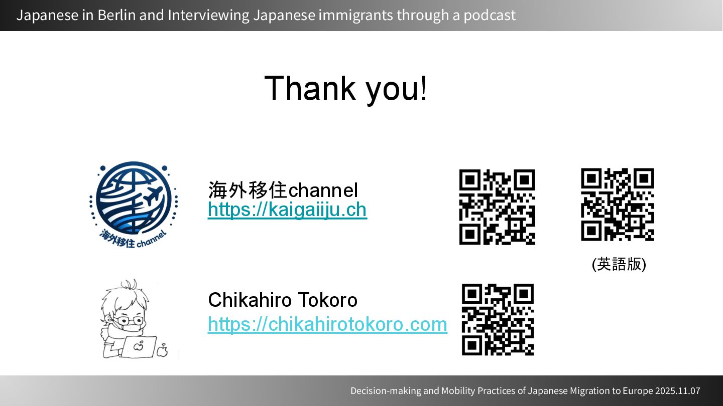 Thank you! Chikahiro Tokoro https://chikahirotokoro.com 海外移住channel https://kaigaiiju.ch Japanese in Berlin and Interviewing Japanese immigrants through a podcast (英語版)