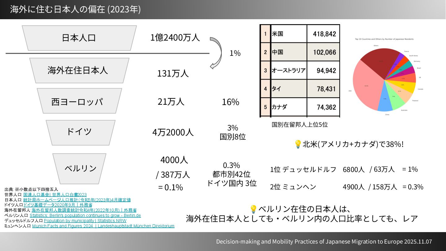 海外に住む⽇本⼈の偏在 (2023年) 出典: ※小数点以下四捨五入 世界人口: 国連人口基金 | 世界人口白書 2023 日本人口: 統計局ホームページ /人口推計(令和 5年(2023年)4月確定値 ドイツ人口:ドイツ基礎データ 2020年9月|外務省 海外在留邦人 : 海外在留邦人数調査統計 令和4年(2022年10月)|外務省 ベルリン人口: Statistics: Berlin's population continues to grow - Berlin.de デュッセルドルフ人口 : Population by municipality | Statistics.NRW ミュンヘン人口 : Munich Facts and Figures 2024 | Landeshauptstadt München Direktorium 3% 国別8位 1% 0.3% 都市別42位 ドイツ国内 3位 1億2400万⼈ 131万⼈ 21万⼈ 4万2000⼈ 4000⼈ ベルリン ⽇本⼈⼝ 海外在住⽇本⼈ ドイツ ⻄ヨーロッパ 16% 国別在留邦⼈上位5位 💡ベルリン在住の⽇本⼈は、 海外在住⽇本⼈としても‧ベルリン内の⼈⼝⽐率としても、レア / 387万⼈ 💡北⽶(アメリカ+カナダ)で38%! 1位 デュッセルドルフ 6800⼈ / 63万⼈ = 1% 2位 ミュンヘン 4900⼈ / 158万⼈ = 0.3% = 0.1%