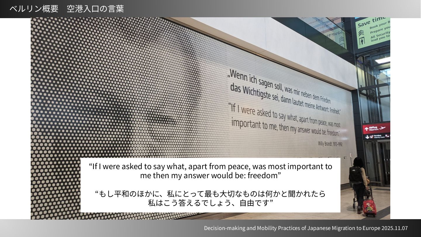 ベルリン概要 空港⼊⼝の⾔葉 “If I were asked to say what, apart from peace, was most important to me then my answer would be: freedom” “もし平和のほかに、私にとって最も⼤切なものは何かと聞かれたら 私はこう答えるでしょう、⾃由です”
