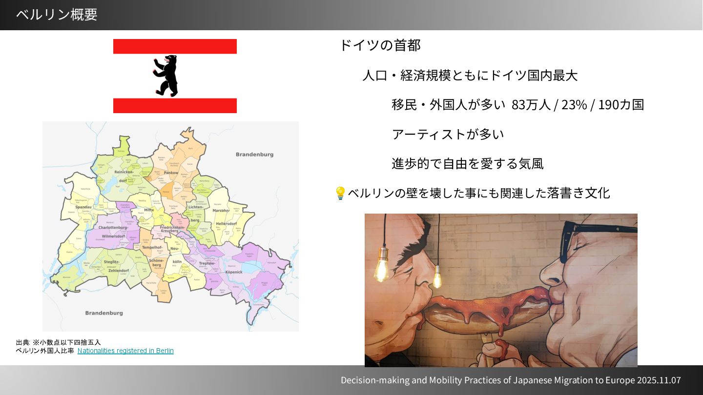 ベルリン概要 出典: ※小数点以下四捨五入 ベルリン外国人比率 : Nationalities registered in Berlin 💡ベルリンの壁を壊した事にも関連した落書き⽂化 ドイツの⾸都 移⺠‧外国⼈が多い 83万⼈ / 23% / 190カ国 ⼈⼝‧経済規模ともにドイツ国内最⼤ アーティストが多い 進歩的で⾃由を愛する気⾵