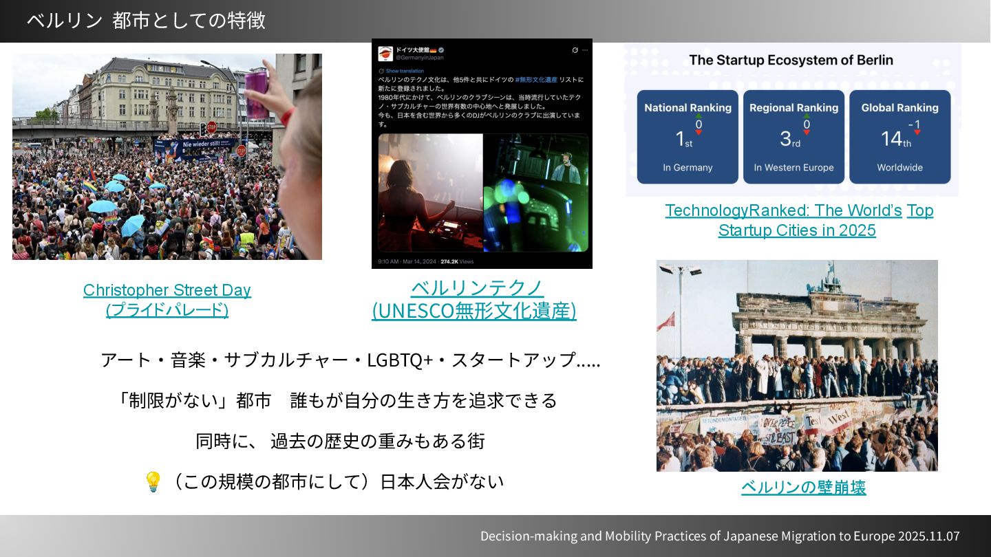 ベルリン 都市としての特徴 ベルリンテクノ (UNESCO無形⽂化遺産) TechnologyRanked: The World’s Top Startup Cities in 2025 ベルリンの壁崩壊 💡(この規模の都市にして)⽇本⼈会がない アート‧⾳楽‧サブカルチャー‧LGBTQ+‧スタートアップ..... 「制限がない」都市 誰もが⾃分の⽣き⽅を追求できる 同時に、 過去の歴史の重みもある街 Christopher Street Day (プライドパレード)