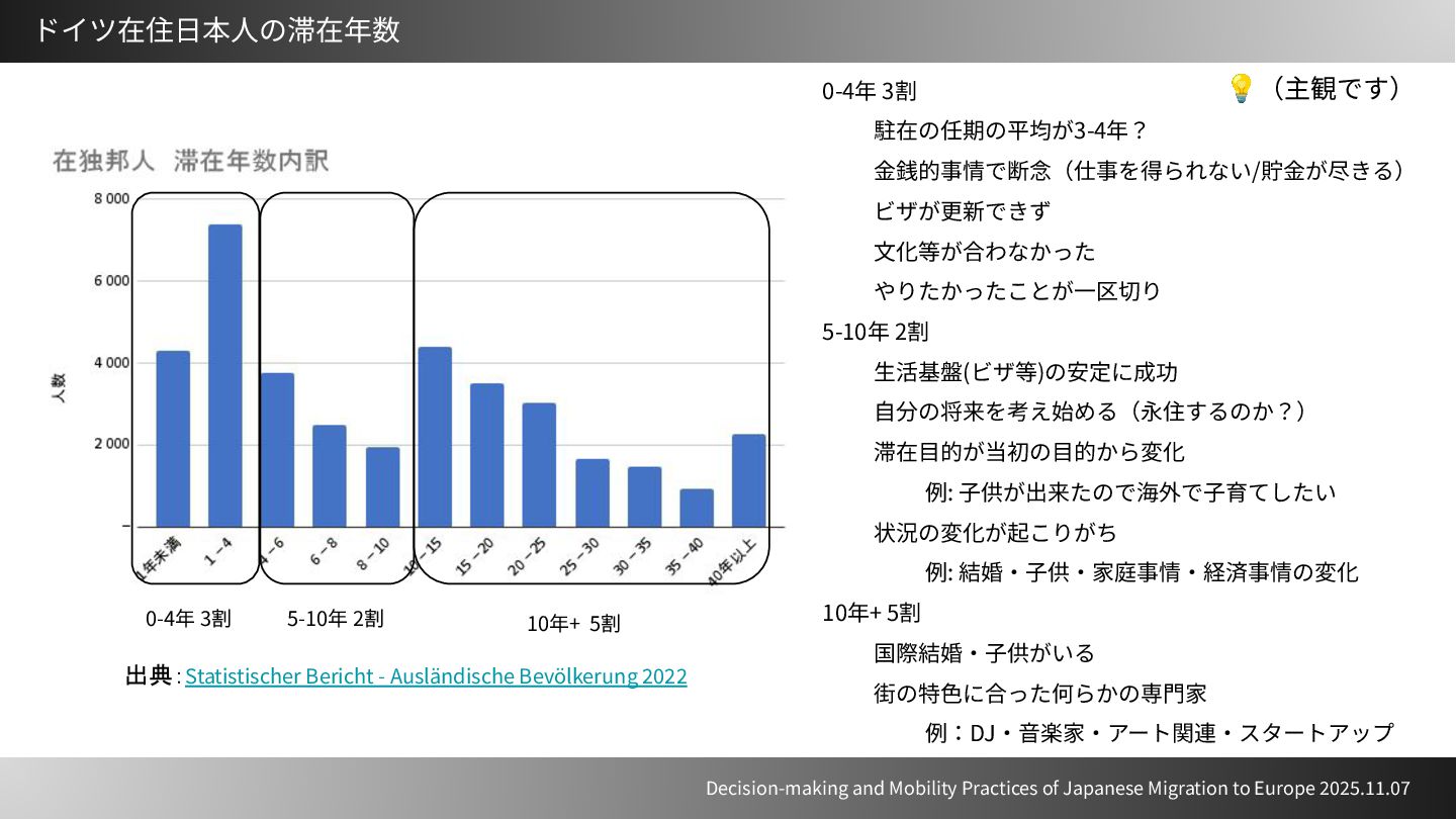 ドイツ在住⽇本⼈の滞在年数 0-4年 3割 出典:Statistischer Bericht - Ausländische Bevölkerung 2022 0-4年 3割 5-10年 2割 10年+ 5割 駐在の任期の平均が3-4年? ビザが更新できず ⾦銭的事情で断念(仕事を得られない/貯⾦が尽きる) 滞在⽬的が当初の⽬的から変化 やりたかったことが⼀区切り 5-10年 2割 ⽂化等が合わなかった 10年+ 5割 例: ⼦供が出来たので海外で⼦育てしたい ⾃分の将来を考え始める(永住するのか?) ⽣活基盤(ビザ等)の安定に成功 状況の変化が起こりがち 例: 結婚‧⼦供‧家庭事情‧経済事情の変化 国際結婚‧⼦供がいる 街の特⾊に合った何らかの専⾨家 例:DJ‧⾳楽家‧アート関連‧スタートアップ 💡(主観です)