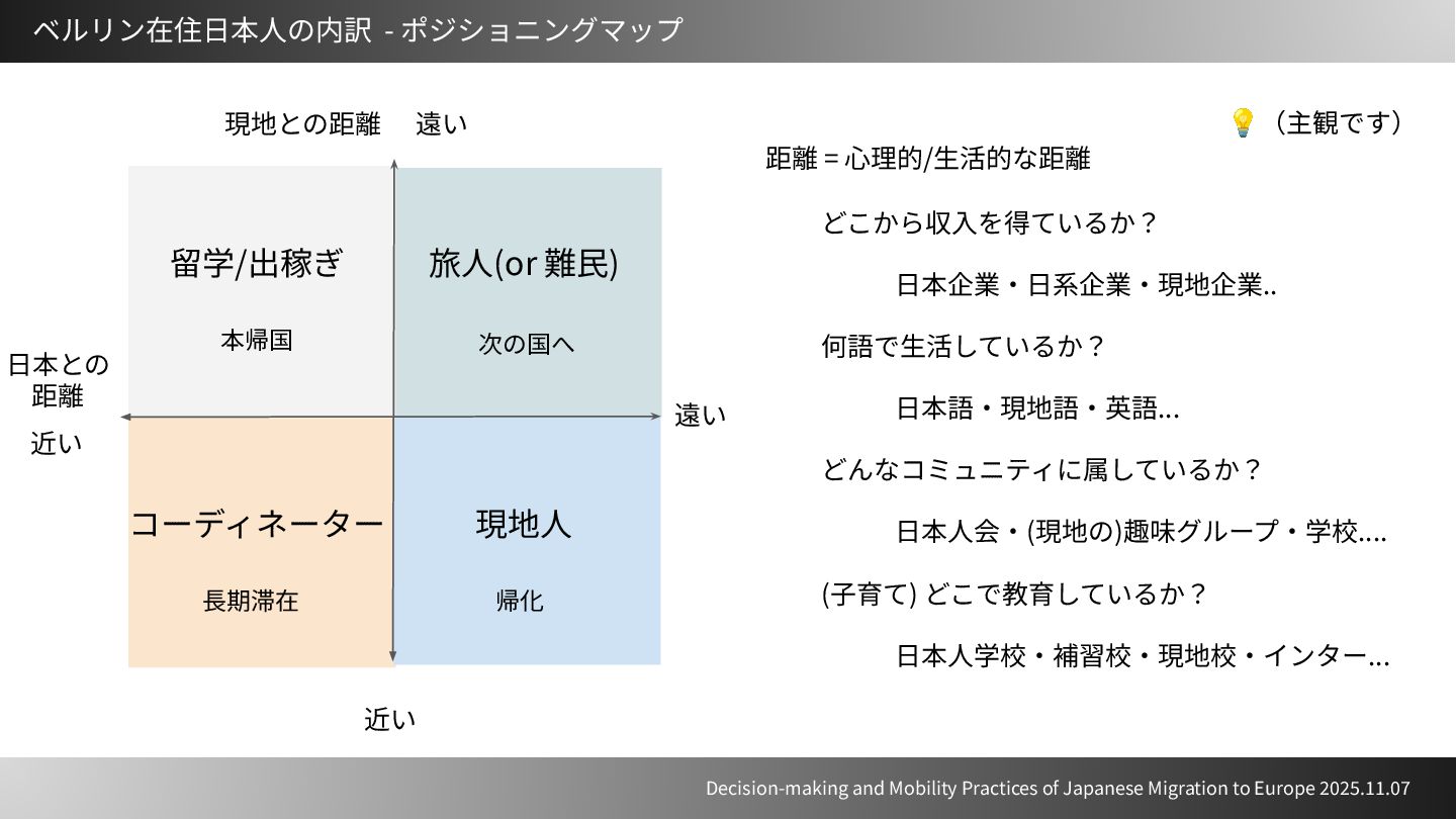 ベルリン在住⽇本⼈の内訳 - ポジショニングマップ ⽇本との 距離 遠い 近い 現地との距離 近い 遠い 旅⼈(or 難⺠) 本帰国 帰化 コーディネーター 距離 = ⼼理的/⽣活的な距離 💡(主観です) 留学/出稼ぎ 次の国へ 現地⼈ ⻑期滞在 どこから収⼊を得ているか? ⽇本企業‧⽇系企業‧現地企業.. 何語で⽣活しているか? ⽇本語‧現地語‧英語... (⼦育て) どこで教育しているか? ⽇本⼈学校‧補習校‧現地校‧インター... どんなコミュニティに属しているか? ⽇本⼈会‧(現地の)趣味グループ‧学校....
