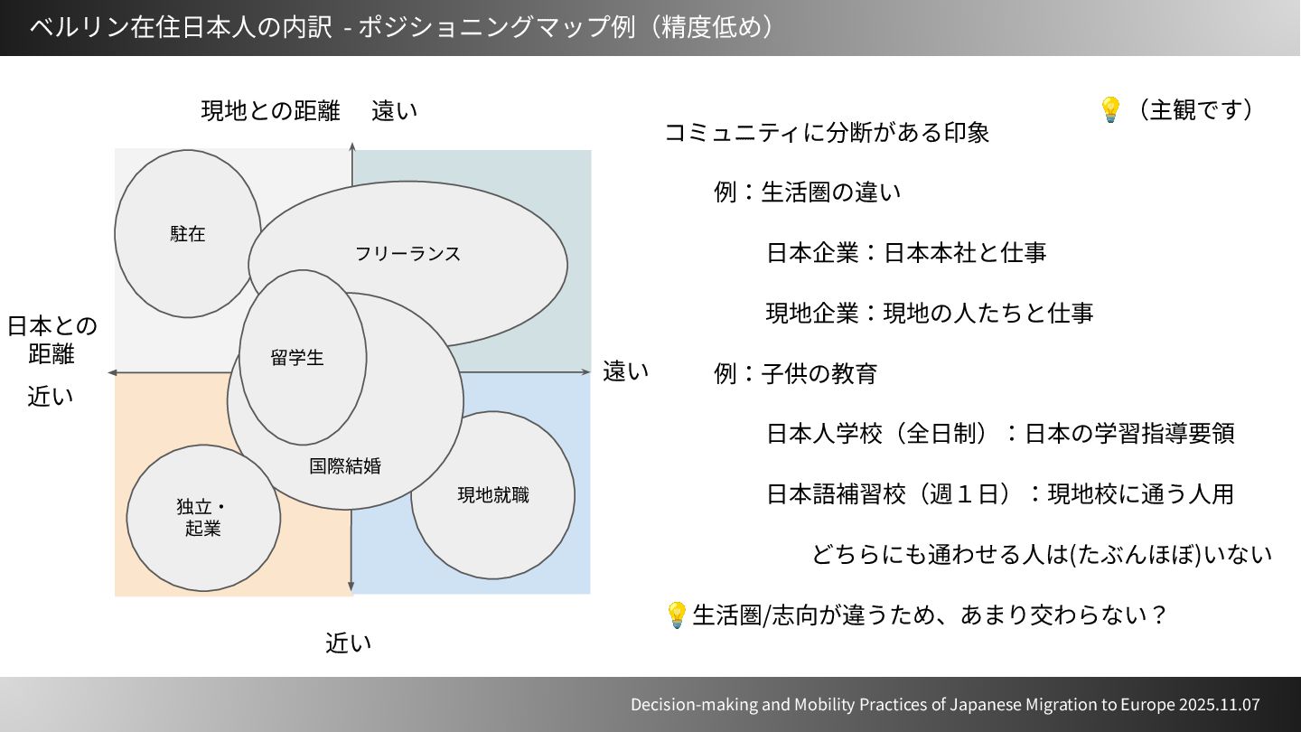 ベルリン在住⽇本⼈の内訳 - ポジショニングマップ例(精度低め) ⽇本との 距離 遠い 近い 現地との距離 近い 遠い 💡(主観です) 駐在 現地就職 例:⼦供の教育 ⽇本⼈学校(全⽇制):⽇本の学習指導要領 ⽇本企業:⽇本本社と仕事 コミュニティに分断がある印象 例:⽣活圏の違い 現地企業:現地の⼈たちと仕事 ⽇本語補習校(週1⽇):現地校に通う⼈⽤ どちらにも通わせる⼈は(たぶんほぼ)いない フリーランス 国際結婚 留学⽣ 💡⽣活圏/志向が違うため、あまり交わらない? 独⽴‧ 起業