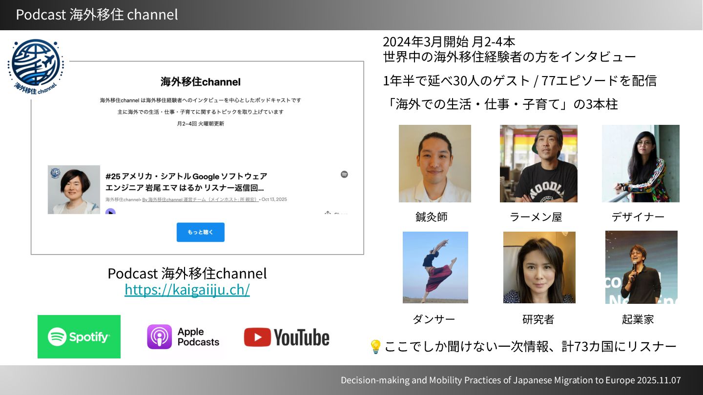 Podcast 海外移住channel https://kaigaiiju.ch/ Podcast 海外移住 channel 2024年3⽉開始 ⽉2-4本 世界中の海外移住経験者の⽅をインタビュー 💡ここでしか聞けない⼀次情報、計73カ国にリスナー 1年半で延べ30⼈のゲスト / 77エピソードを配信 「海外での⽣活‧仕事‧⼦育て」の3本柱 研究者 鍼灸師 ダンサー ラーメン屋 デザイナー 起業家