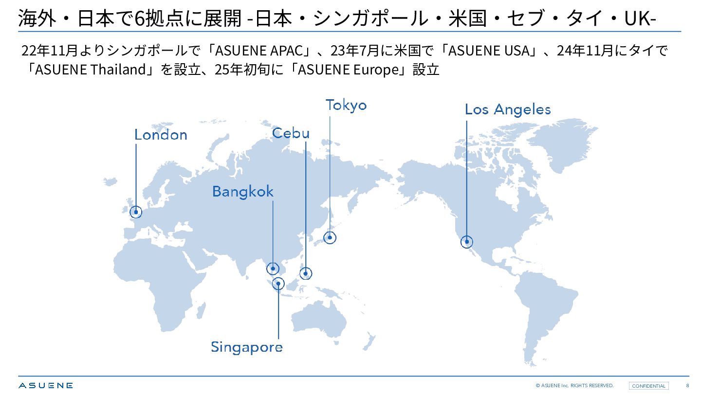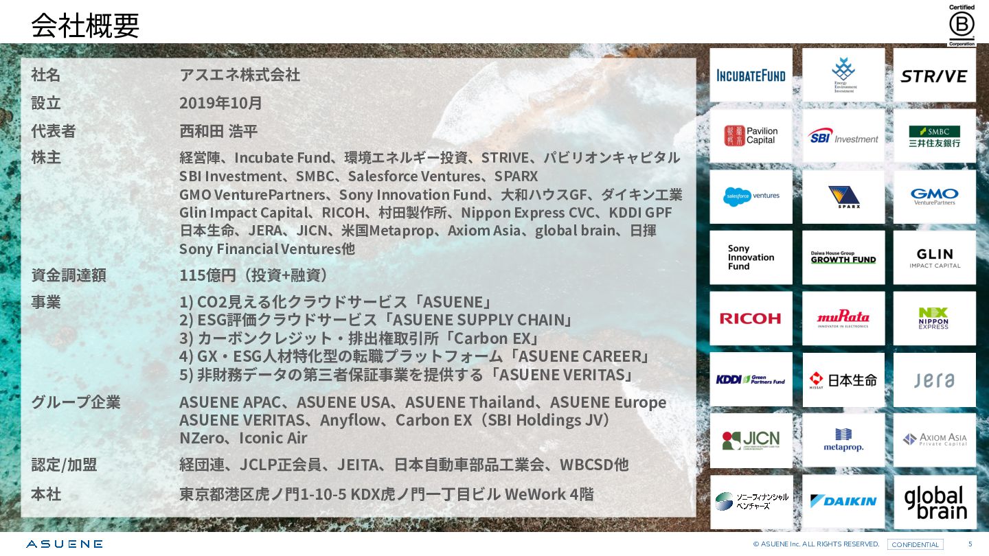 アスエネ株式会社 設⽴ 2019年10⽉ 代表者 ⻄和⽥ 浩平 株主 経営陣、Incubate Fund、環境エネルギー投資、STRIVE、パビリオンキャピタル SBI Investment、SMBC、Salesforce Ventures、SPARX GMO VenturePartners、Sony Innovation Fund、⼤和ハウスGF、ダイキン⼯業 Glin Impact Capital、RICOH、村⽥製作所、Nippon Express CVC、KDDI GPF ⽇本⽣命、JERA、JICN、⽶国Metaprop、Axiom Asia、global brain、⽇揮 Sony Financial Ventures他 資⾦調達額 115億円(投資+融資) 事業 1) CO2⾒える化クラウドサービス「ASUENE」 2) ESG評価クラウドサービス「ASUENE SUPPLY CHAIN」 3) カーボンクレジット‧排出権取引所「Carbon EX」 4) GX‧ESG⼈材特化型の転職プラットフォーム「ASUENE CAREER」 5) ⾮財務データの第三者保証事業を提供する「ASUENE VERITAS」 グループ企業 ASUENE APAC、ASUENE USA、ASUENE Thailand、ASUENE Europe ASUENE VERITAS、Anyflow、Carbon EX(SBI Holdings JV) NZero、Iconic Air 認定/加盟 経団連、JCLP正会員、JEITA、⽇本⾃動⾞部品⼯業会、WBCSD他 本社 東京都港区虎ノ⾨1-10-5 KDX虎ノ⾨⼀丁⽬ビル WeWork 4階