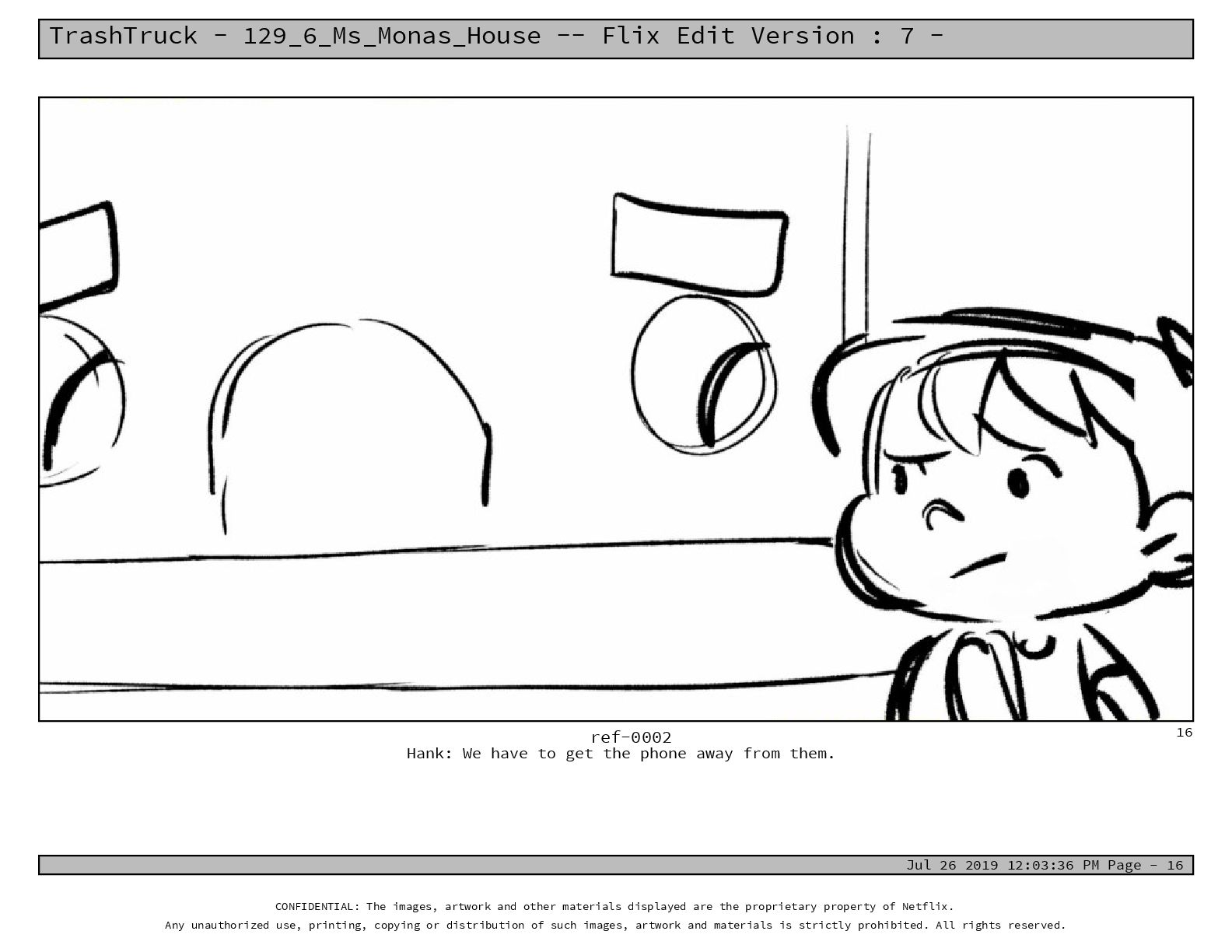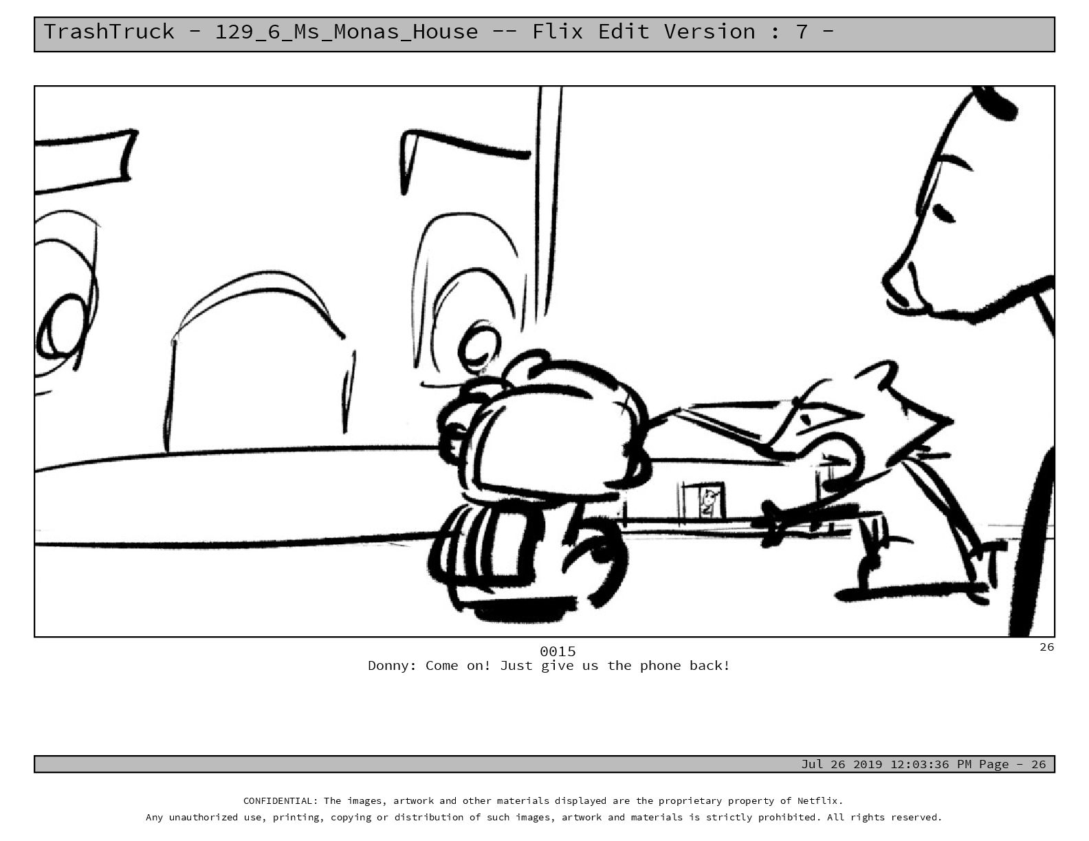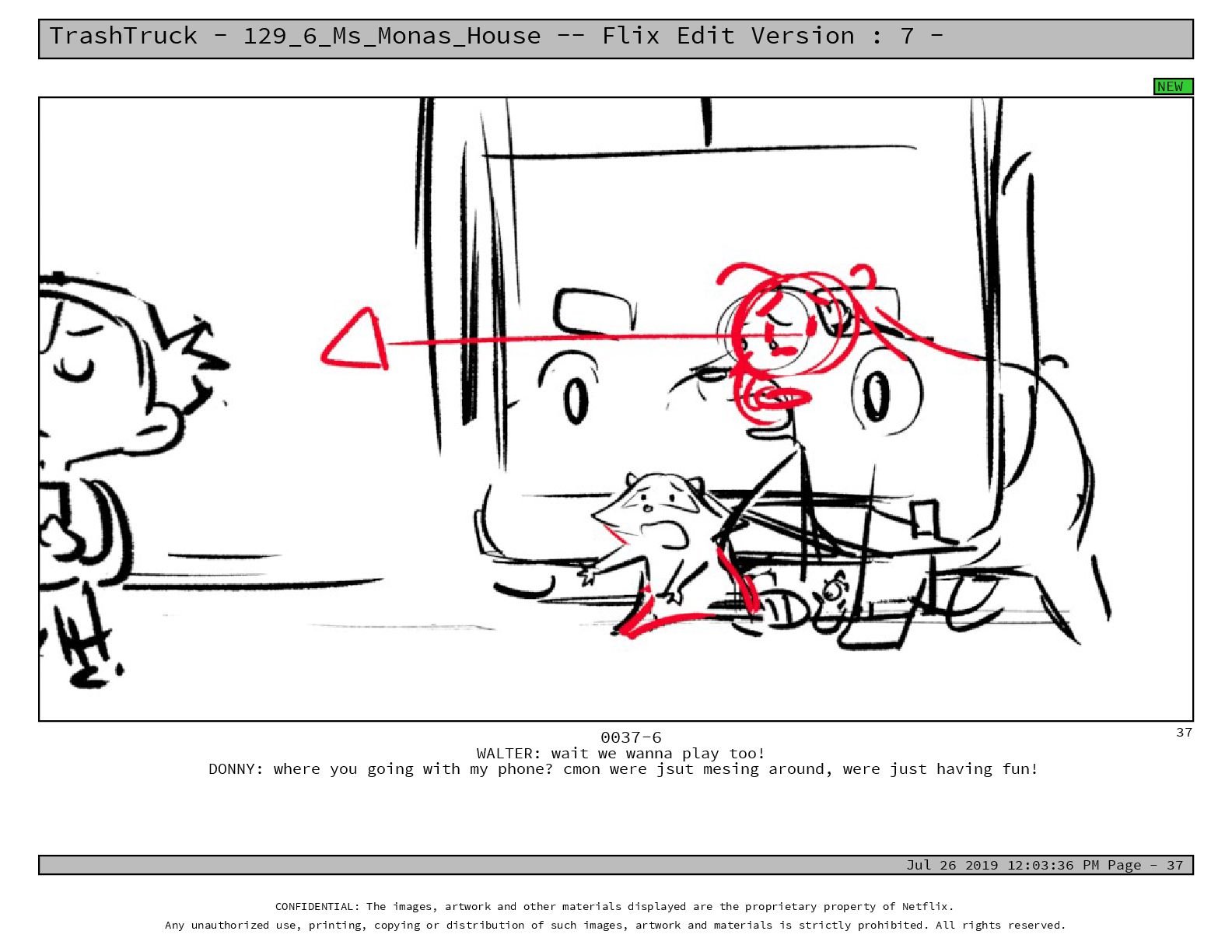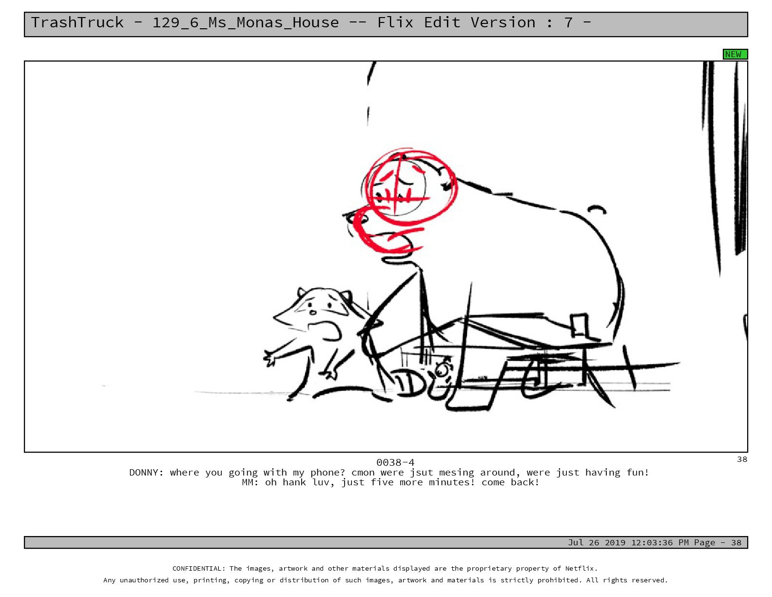 Jul 26 2019 12:03:36 PM Page - 38 CONFIDENTIAL: The images, artwork and other materials displayed are the proprietary property of Netflix. Any unauthorized use, printing, copying or distribution of such images, artwork and materials is strictly prohibited. All rights reserved. 0038-4 DONNY: where you going with my phone? cmon were jsut mesing around, were just having fun! MM: oh hank luv, just five more minutes! come back! 38 NEW