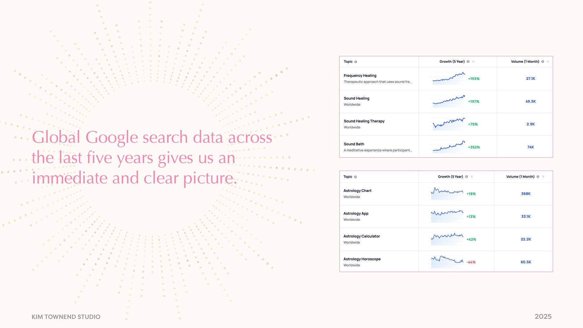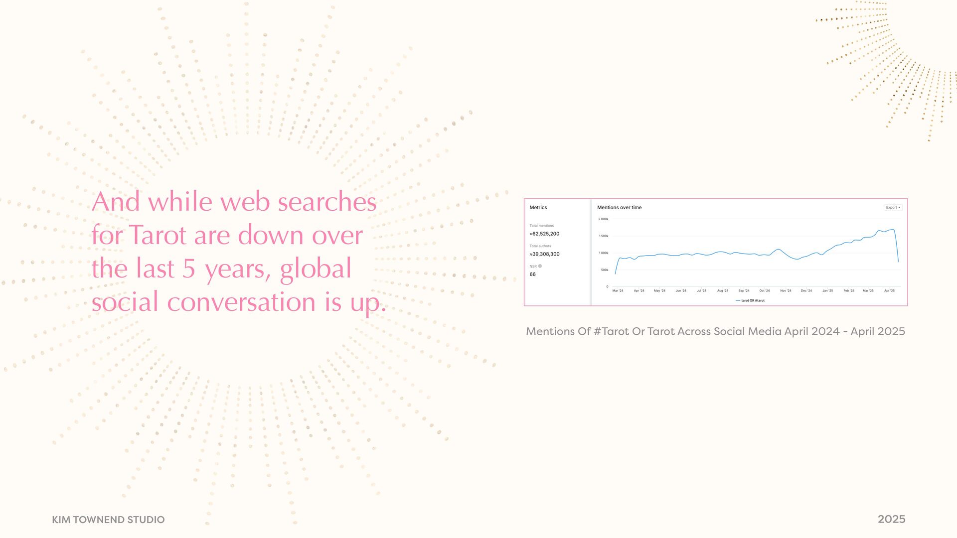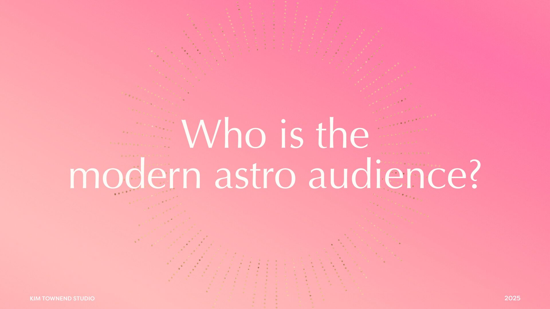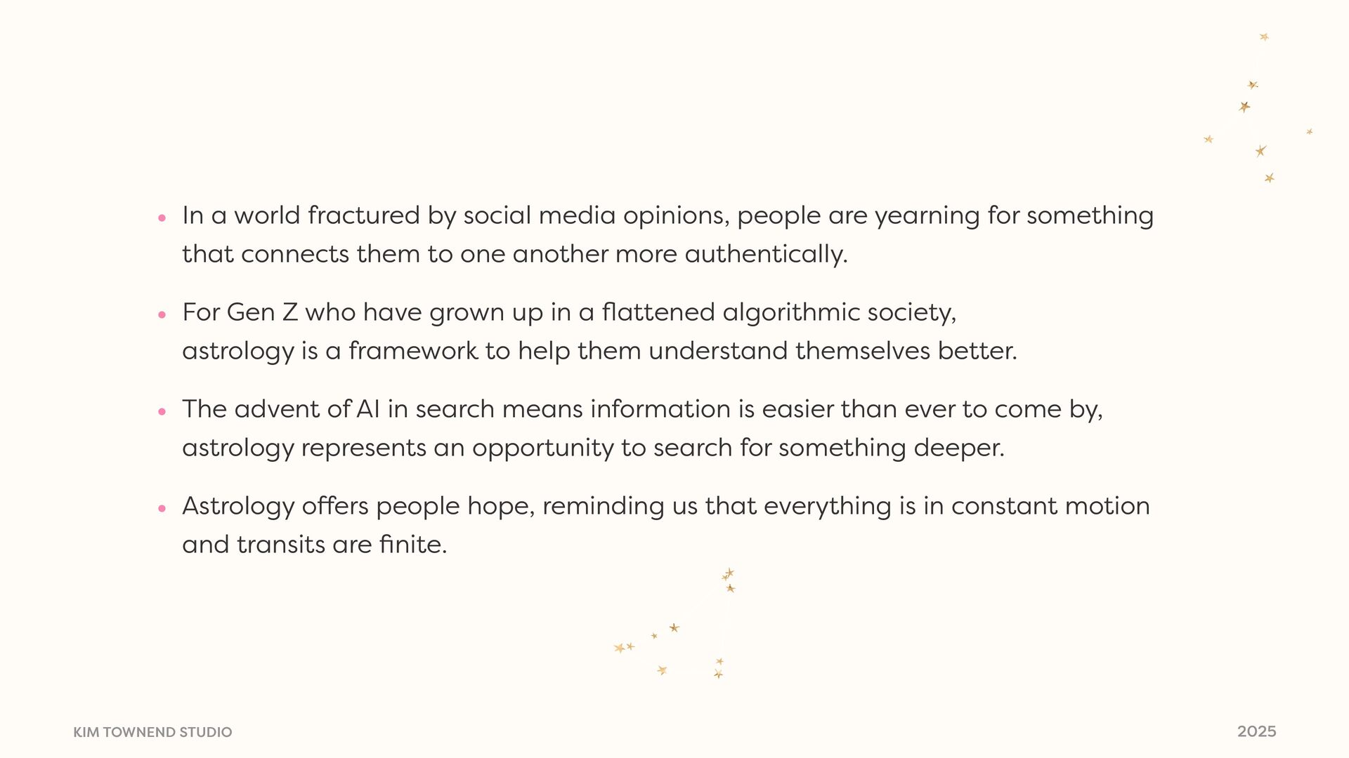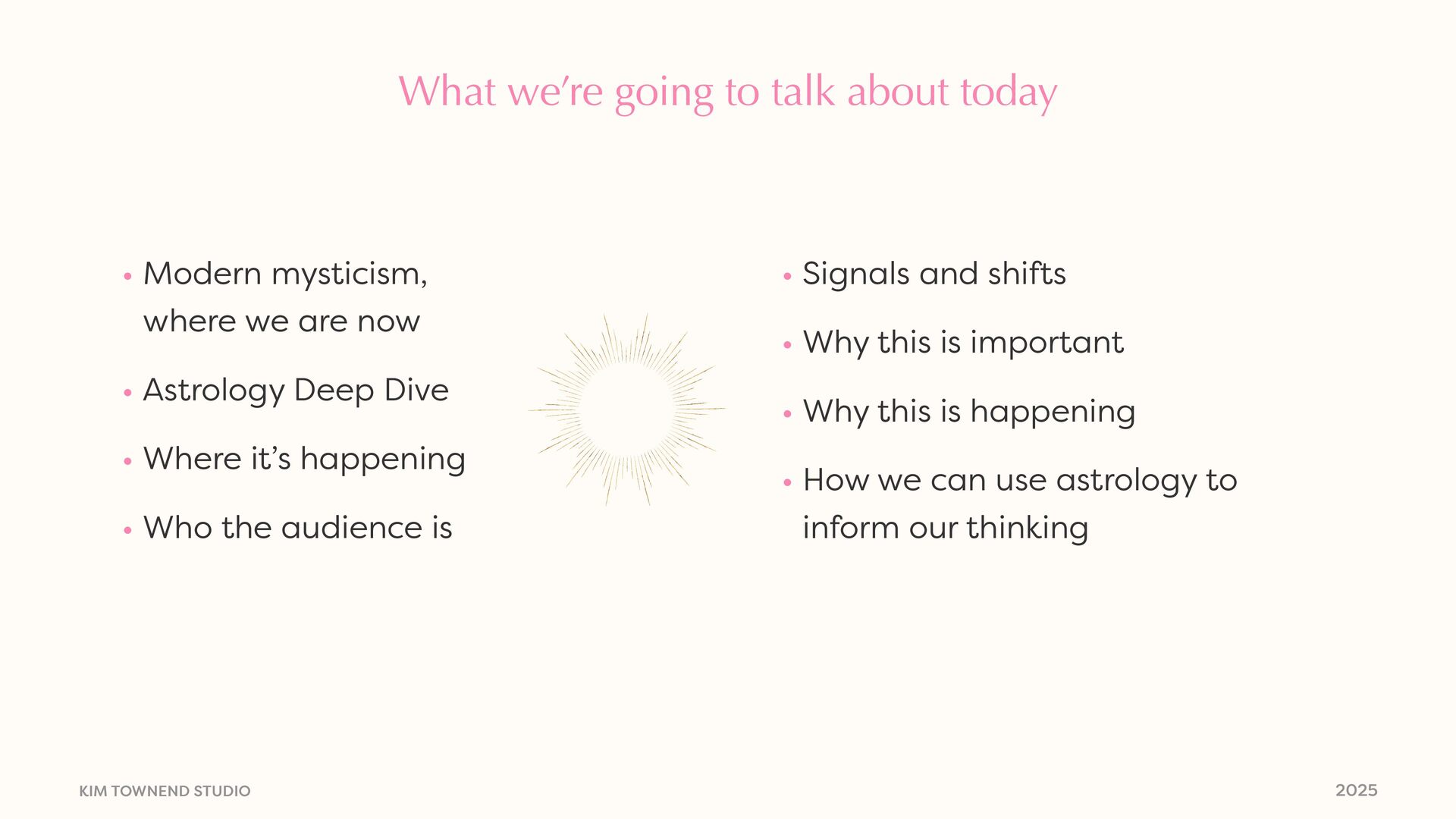 today • Modern mysticism, where we are now • Astrology Deep Dive • Where it’s happening • Who the audience is • Signals and shifts • Why this is important • Why this is happening • How we can use astrology to inform our thinking