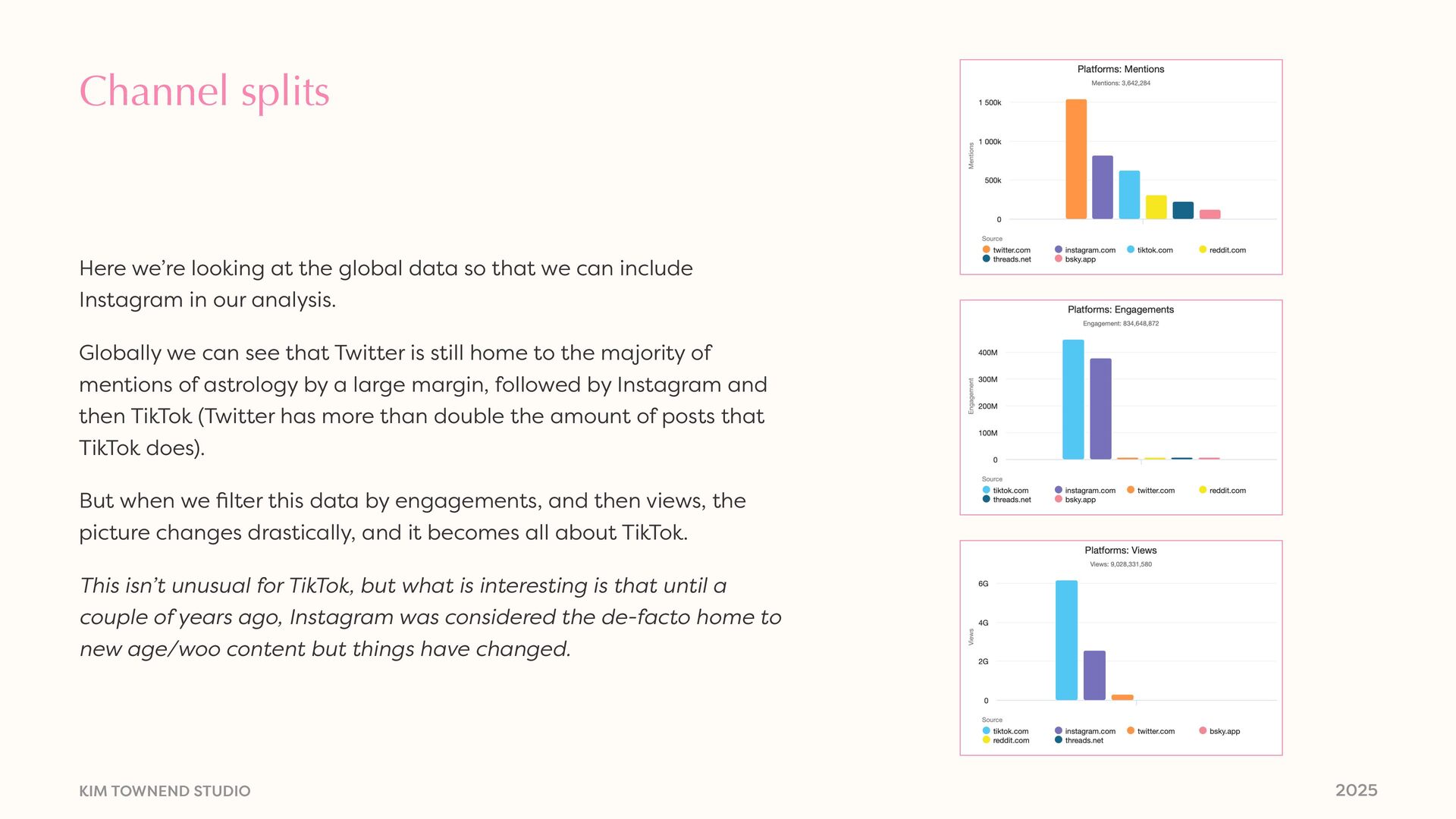 the global data so that we can include Instagram in our analysis. Globally we can see that Twitter is still home to the majority of mentions of astrology by a large margin, followed by Instagram and then TikTok (Twitter has more than double the amount of posts that TikTok does). But when we fi lter this data by engagements, and then views, the picture changes drastically, and it becomes all about TikTok. This isn’t unusual for TikTok, but what is interesting is that until a couple of years ago, Instagram was considered the de-facto home to new age/woo content but things have changed.