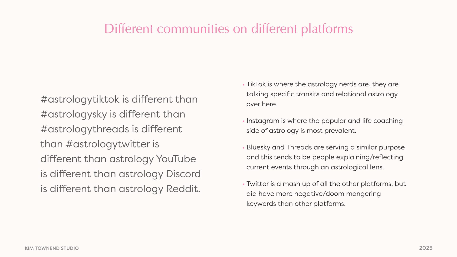 is di ff erent than #astrologysky is di ff erent than #astrologythreads is di ff erent than #astrologytwitter is di ff erent than astrology YouTube is di ff erent than astrology Discord is di ff erent than astrology Reddit. • TikTok is where the astrology nerds are, they are talking speci fi c transits and relational astrology over here. • Instagram is where the popular and life coaching side of astrology is most prevalent. • Bluesky and Threads are serving a similar purpose and this tends to be people explaining/re fl ecting current events through an astrological lens. • Twitter is a mash up of all the other platforms, but did have more negative/doom mongering keywords than other platforms.