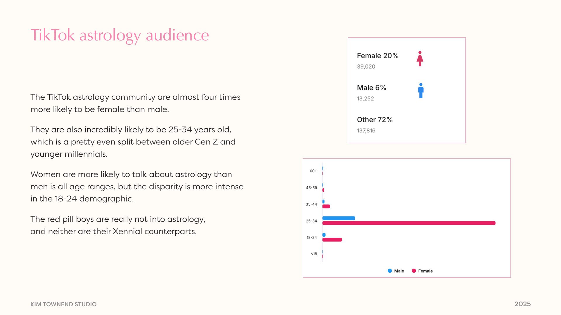 community are almost four times more likely to be female than male. They are also incredibly likely to be 25-34 years old, which is a pretty even split between older Gen Z and younger millennials. Women are more likely to talk about astrology than men is all age ranges, but the disparity is more intense in the 18-24 demographic. The red pill boys are really not into astrology, and neither are their Xennial counterparts.