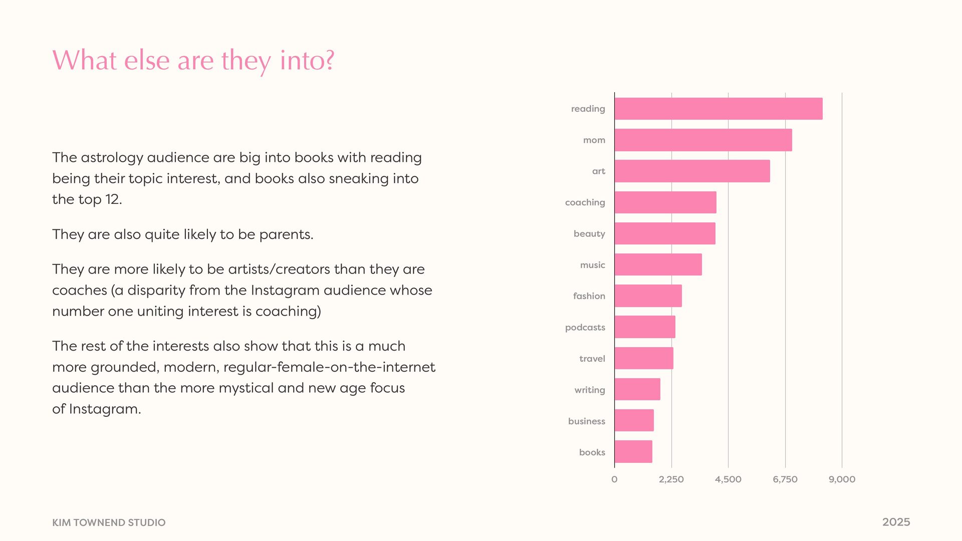 mom art coaching beauty music fashion podcasts travel writing business books 0 2,250 4,500 6,750 9,000 The astrology audience are big into books with reading being their topic interest, and books also sneaking into the top 12. They are also quite likely to be parents. They are more likely to be artists/creators than they are coaches (a disparity from the Instagram audience whose number one uniting interest is coaching) The rest of the interests also show that this is a much more grounded, modern, regular-female-on-the-internet audience than the more mystical and new age focus of Instagram.