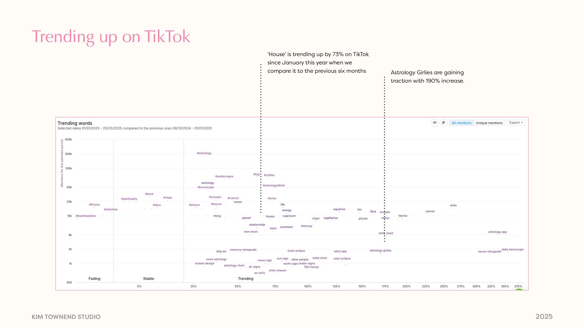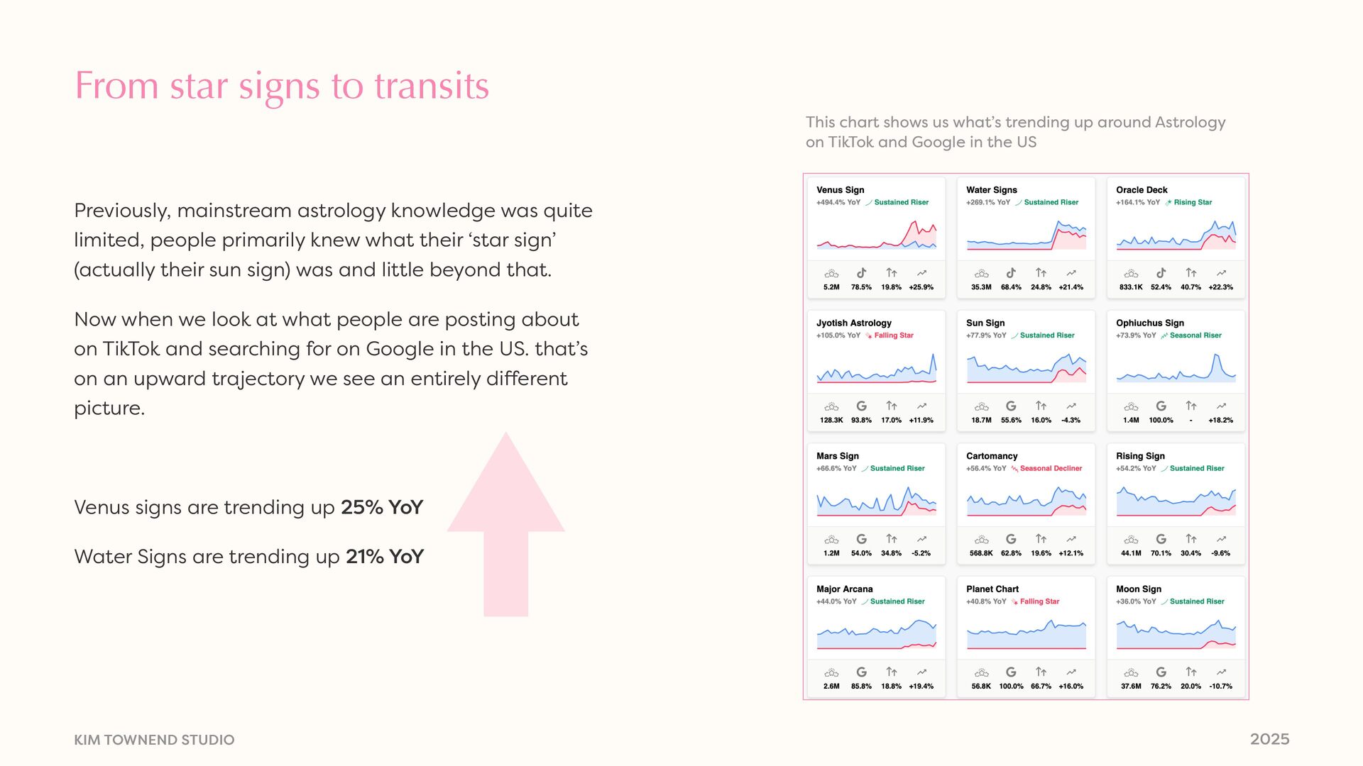 trending up by 73% on TikTok since January this year when we compare it to the previous six months Astrology Girlies are gaining traction with 190% increase.