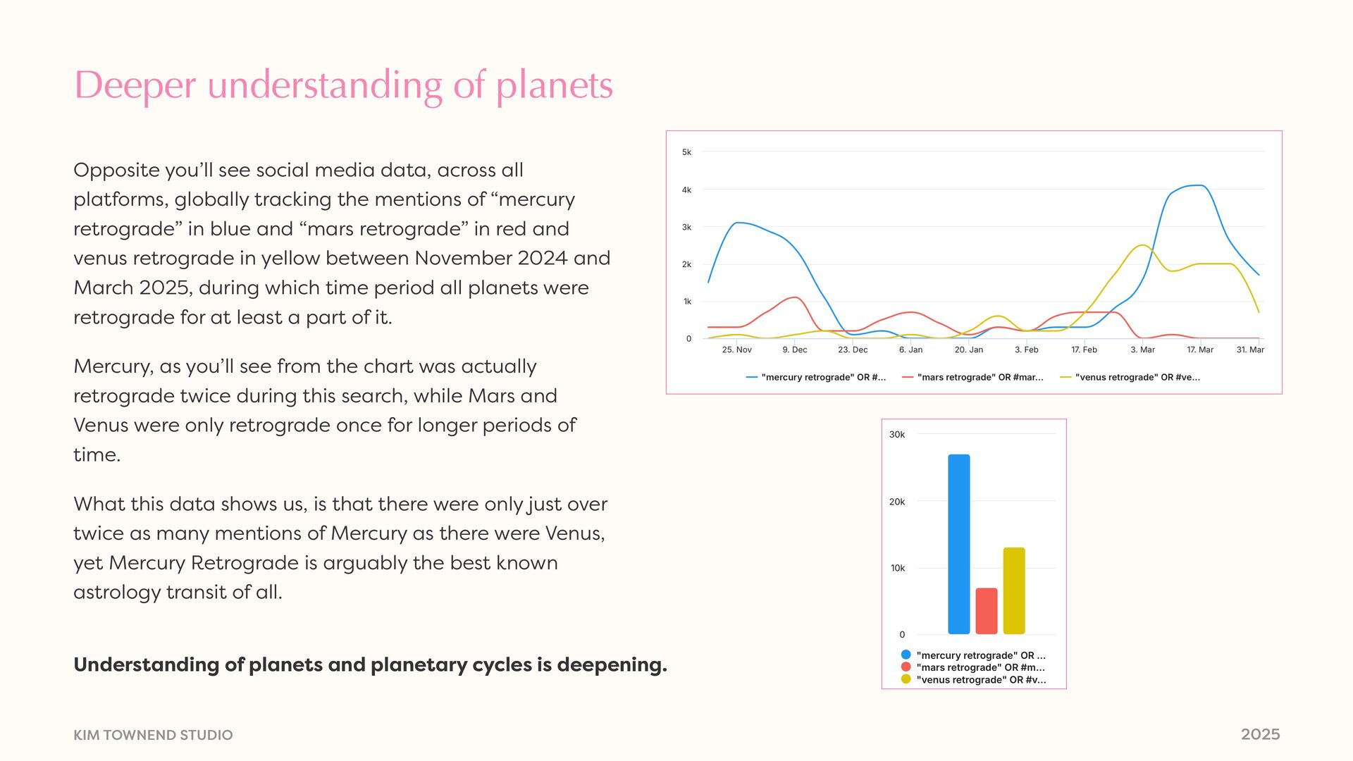 see social media data, across all platforms, globally tracking the mentions of “mercury retrograde” in blue and “mars retrograde” in red and venus retrograde in yellow between November 2024 and March 2025, during which time period all planets were retrograde for at least a part of it. Mercury, as you’ll see from the chart was actually retrograde twice during this search, while Mars and Venus were only retrograde once for longer periods of time. What this data shows us, is that there were only just over twice as many mentions of Mercury as there were Venus, yet Mercury Retrograde is arguably the best known astrology transit of all. Understanding of planets and planetary cycles is deepening.