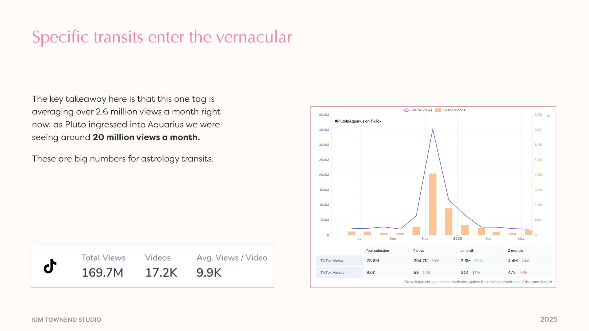 this one tag is averaging over 2.6 million views a month right now, as Pluto ingressed into Aquarius we were seeing around 20 million views a month. These are big numbers for astrology transits. Specific transits enter the vernacular