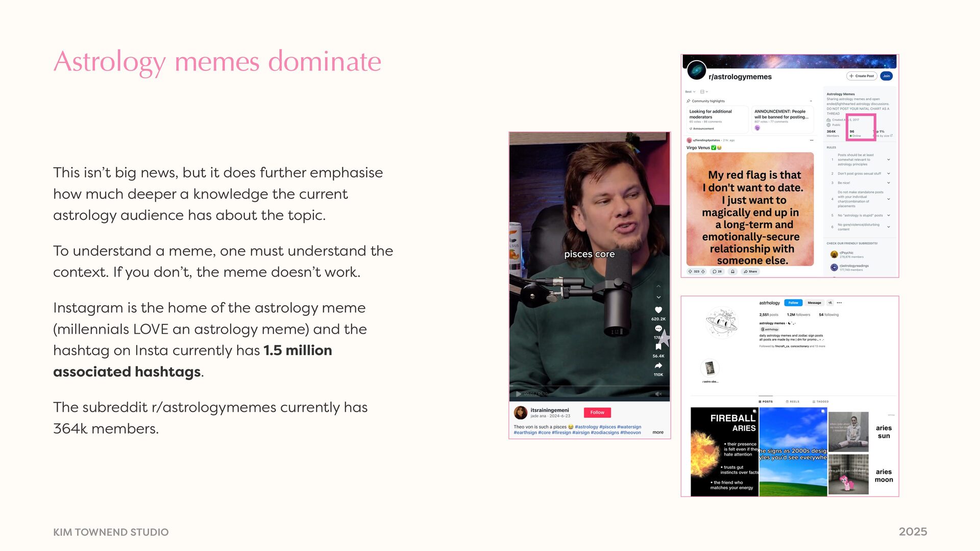news, but it does further emphasise how much deeper a knowledge the current astrology audience has about the topic. To understand a meme, one must understand the context. If you don’t, the meme doesn’t work. Instagram is the home of the astrology meme (millennials LOVE an astrology meme) and the hashtag on Insta currently has 1.5 million associated hashtags. The subreddit r/astrologymemes currently has 364k members.