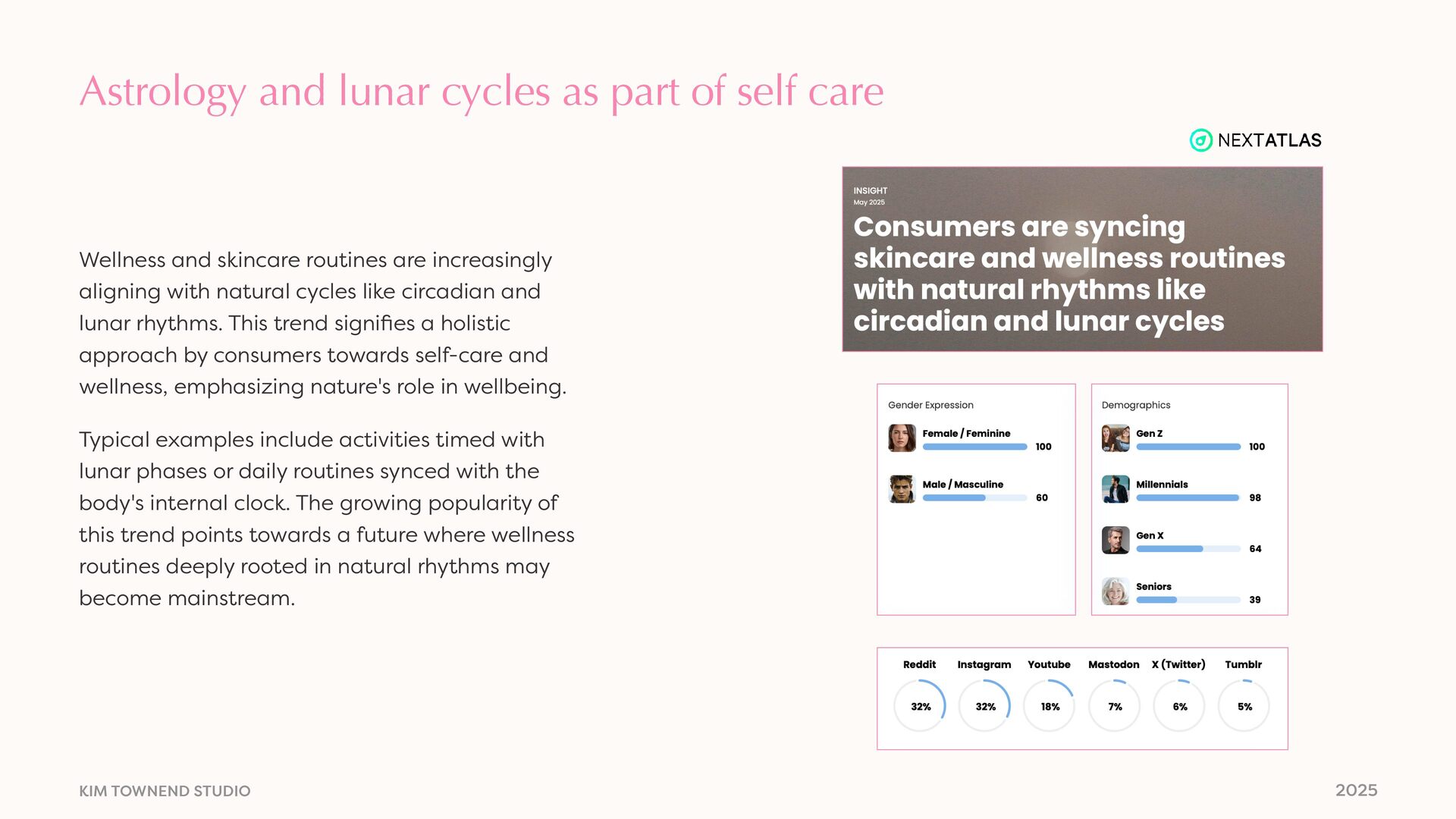 of self care Wellness and skincare routines are increasingly aligning with natural cycles like circadian and lunar rhythms. This trend signi fi es a holistic approach by consumers towards self-care and wellness, emphasizing nature's role in wellbeing. Typical examples include activities timed with lunar phases or daily routines synced with the body's internal clock. The growing popularity of this trend points towards a future where wellness routines deeply rooted in natural rhythms may become mainstream.