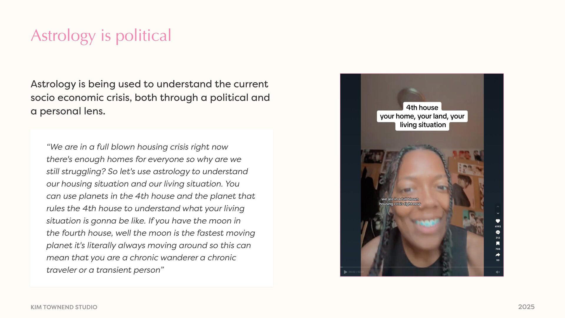 a full blown housing crisis right now there's enough homes for everyone so why are we still struggling? So let's use astrology to understand our housing situation and our living situation. You can use planets in the 4th house and the planet that rules the 4th house to understand what your living situation is gonna be like. If you have the moon in the fourth house, well the moon is the fastest moving planet it's literally always moving around so this can mean that you are a chronic wanderer a chronic traveler or a transient person” Astrology is being used to understand the current socio economic crisis, both through a political and a personal lens.