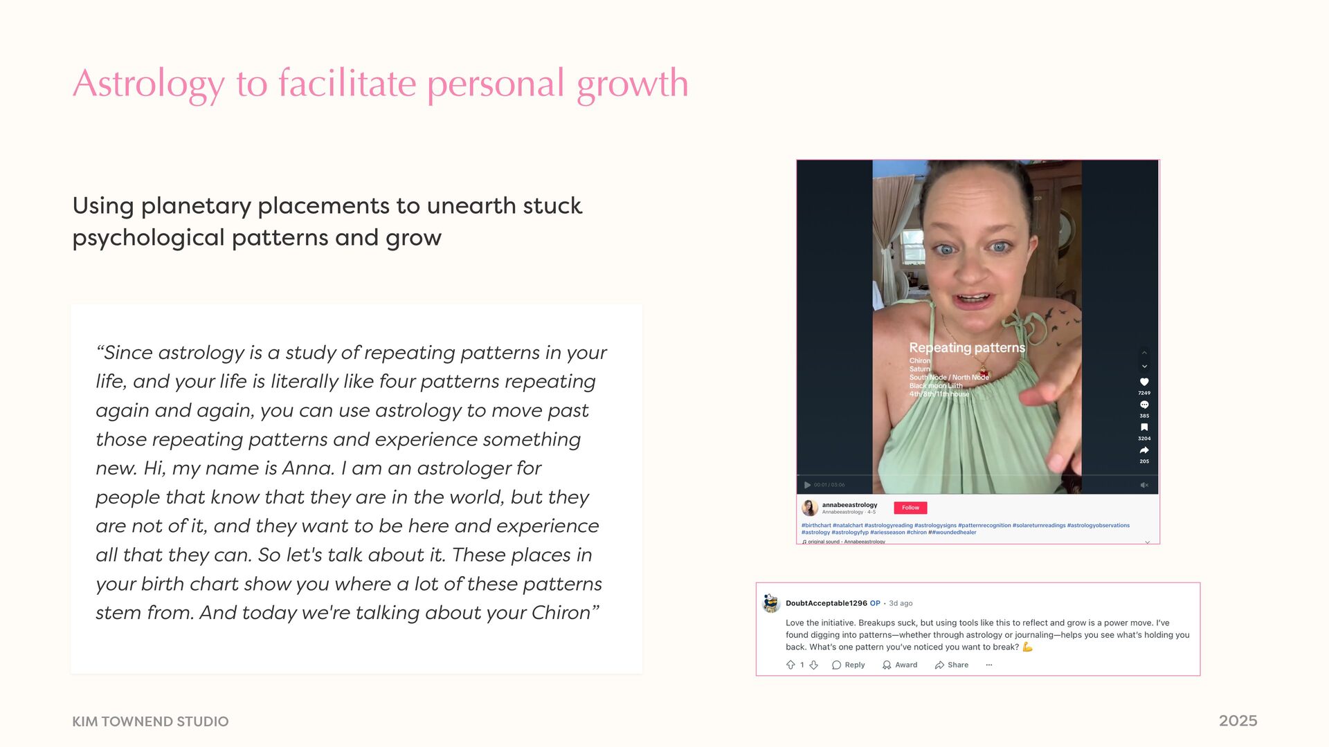 of repeating patterns in your life, and your life is literally like four patterns repeating again and again, you can use astrology to move past those repeating patterns and experience something new. Hi, my name is Anna. I am an astrologer for people that know that they are in the world, but they are not of it, and they want to be here and experience all that they can. So let's talk about it. These places in your birth chart show you where a lot of these patterns stem from. And today we're talking about your Chiron” Using planetary placements to unearth stuck psychological patterns and grow