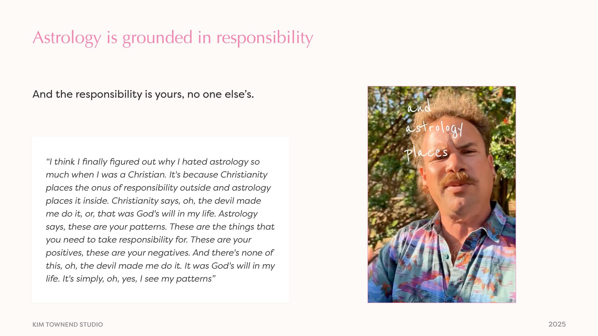 think I fi nally fi gured out why I hated astrology so much when I was a Christian. It's because Christianity places the onus of responsibility outside and astrology places it inside. Christianity says, oh, the devil made me do it, or, that was God's will in my life. Astrology says, these are your patterns. These are the things that you need to take responsibility for. These are your positives, these are your negatives. And there's none of this, oh, the devil made me do it. It was God's will in my life. It's simply, oh, yes, I see my patterns” And the responsibility is yours, no one else’s.