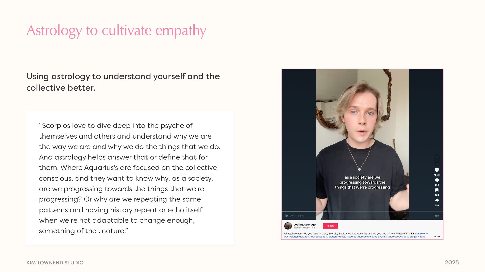 to dive deep into the psyche of themselves and others and understand why we are the way we are and why we do the things that we do. And astrology helps answer that or de fi ne that for them. Where Aquarius's are focused on the collective conscious, and they want to know why, as a society, are we progressing towards the things that we're progressing? Or why are we repeating the same patterns and having history repeat or echo itself when we're not adaptable to change enough, something of that nature.” Using astrology to understand yourself and the collective better.