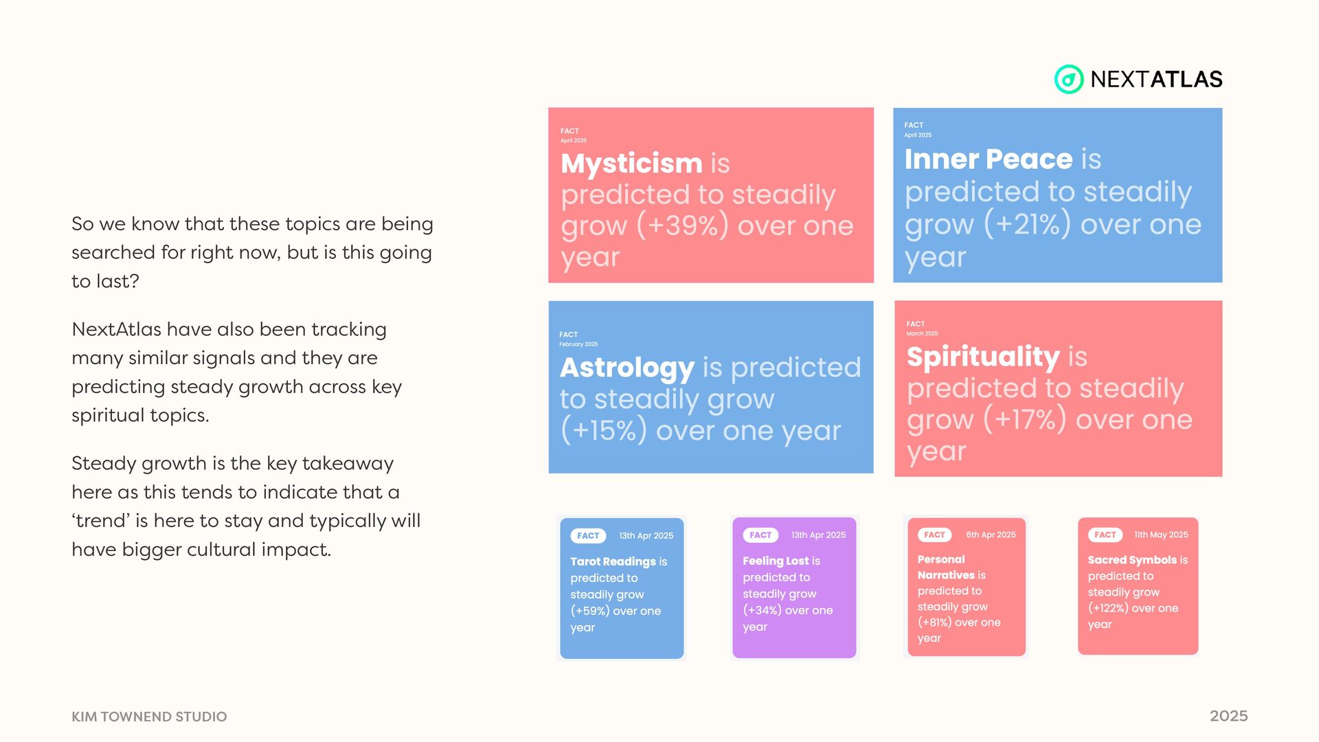 are being searched for right now, but is this going to last? NextAtlas have also been tracking many similar signals and they are predicting steady growth across key spiritual topics. Steady growth is the key takeaway here as this tends to indicate that a ‘trend’ is here to stay and typically will have bigger cultural impact.