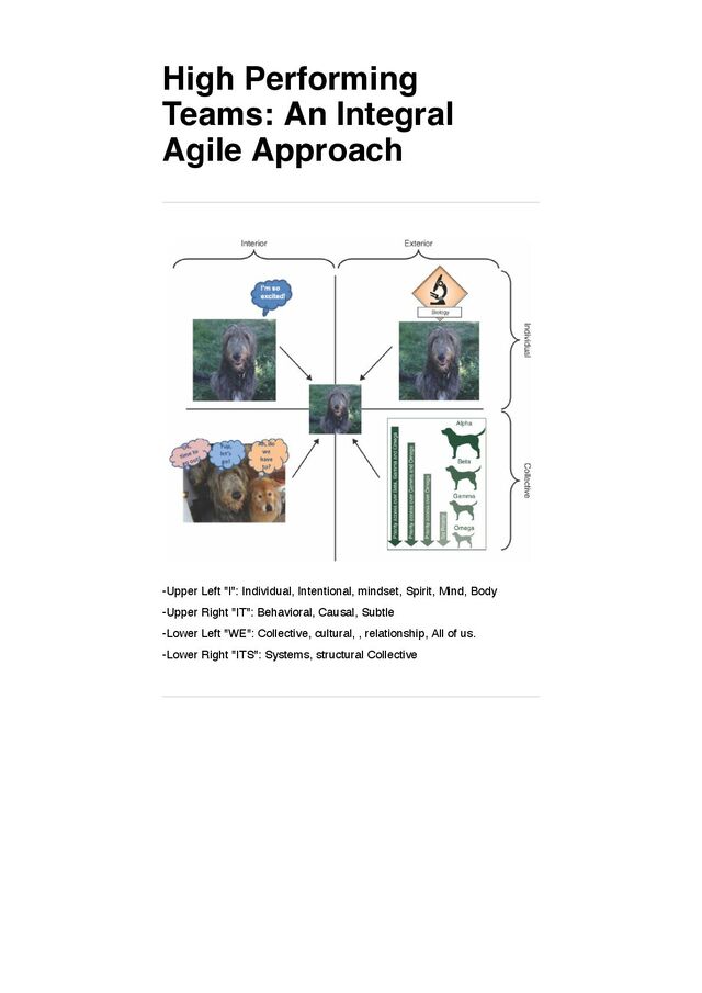 Individual, Intentional, mindset, Spirit, Mind, Body -Upper Right "IT": Behavioral, Causal, Subtle -Lower Left "WE": Collective, cultural, , relationship, All of us. -Lower Right "ITS": Systems, structural Collective