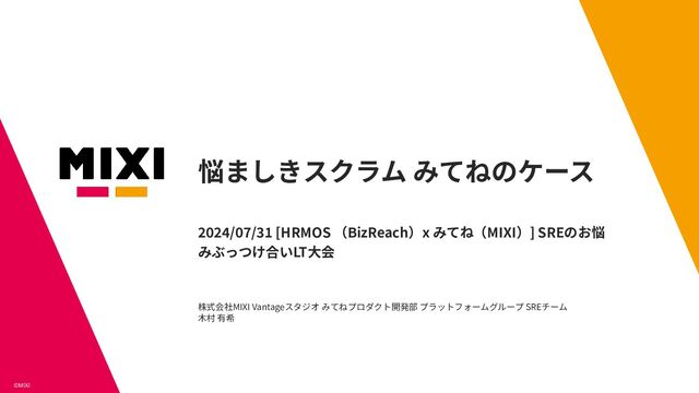 1. ©MIXI 悩ましきスクラム みてねのケース 2024/07/31 [HRMOS (BizReach)x みてね(MIXI)] SREのお悩 みぶっつけ合いLT⼤会 株式会社MIXI