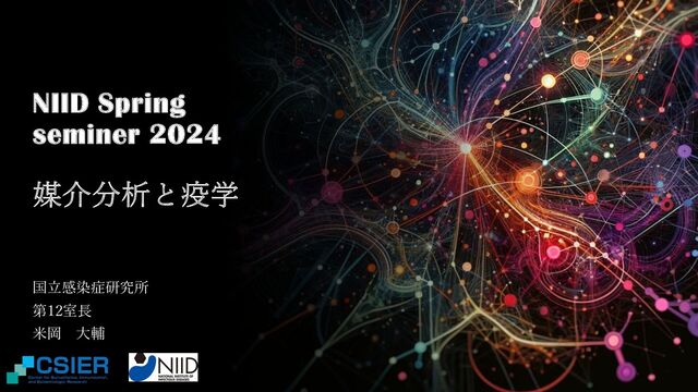 Y(a*) = Y(a, M(a)) ‒ Y(a*, M(a*)) 直接効果 ・⾃然な直接効果/純粋な直接効果 (natural direct effect / pure direct effect) PDE(a, a*) = Y(a, M(a*)) − Y(a*, M(a*)) ・総合直接効果(total direct effect) TDE(a, a*) = Y(a, M(a)) − Y(a*, M(a)) 18/24 ⾔葉でいうと:PDEでM(a)をM(a*)とした場合 ⾔葉でいうと:処置aとa*を⽐較ときの反応変数の差 ⾔葉でいうと:処理が a* であったとするときに⾃ずと⽣じるであろう状態を維持したときの 処理 a と処理 a* とを⽐較したときの効果