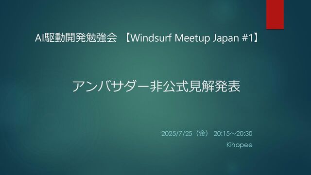 アンバサダー非公式見解発表 2025/7/25(金) 20:15〜20:30 Kinopee AI駆動開発勉強会 【Windsurf Meetup Japan #1】