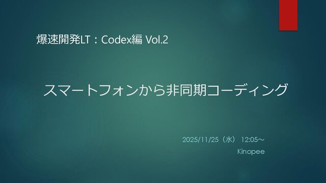スマートフォンから非同期コーディング 2025/11/25(水) 12:05〜 Kinopee 爆速開発LT:Codex編 Vol.2