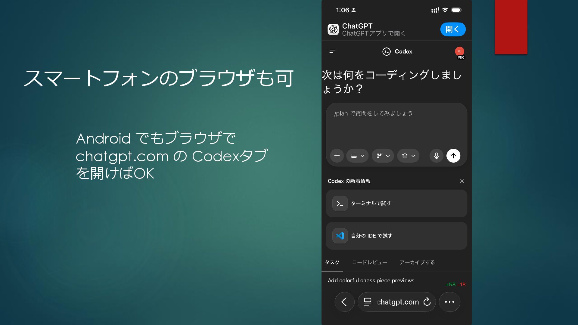 Android でもブラウザで chatgpt.com の Codexタブ を開けばOK スマートフォンのブラウザも可