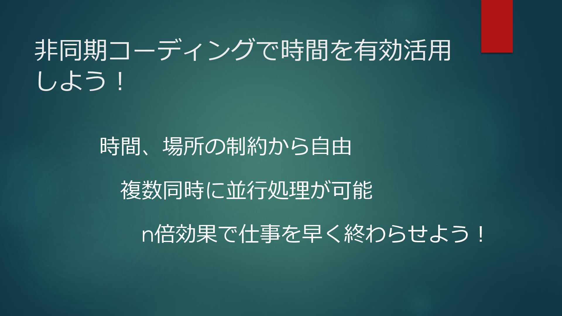 非同期コーディングで時間を有効活用 しよう! 時間、場所の制約から自由 複数同時に並行処理が可能 n倍効果で仕事を早く終わらせよう!