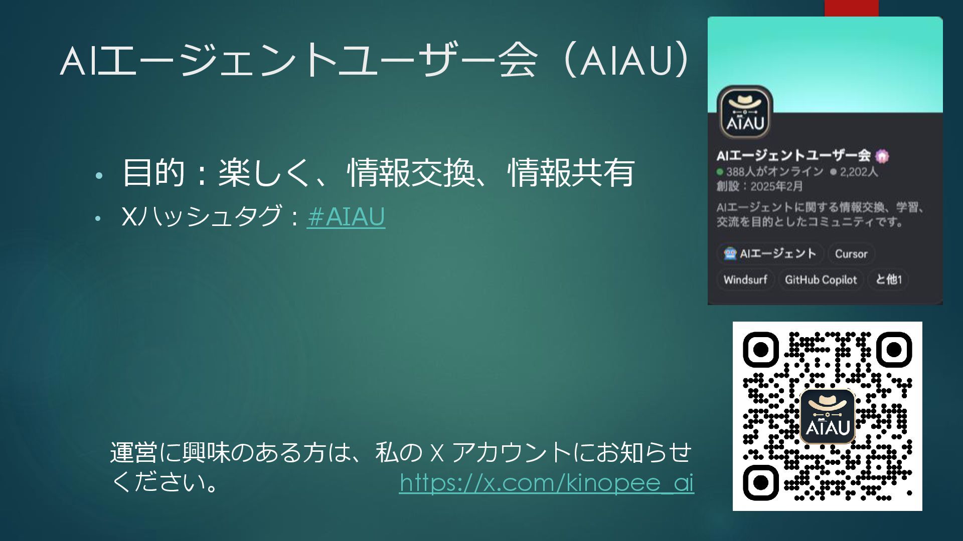AIエージェントユーザー会(AIAU) • 目的:楽しく、情報交換、情報共有 • Xハッシュタグ:#AIAU 運営に興味のある方は、私の X アカウントにお知らせ ください。 https://x.com/kinopee_ai