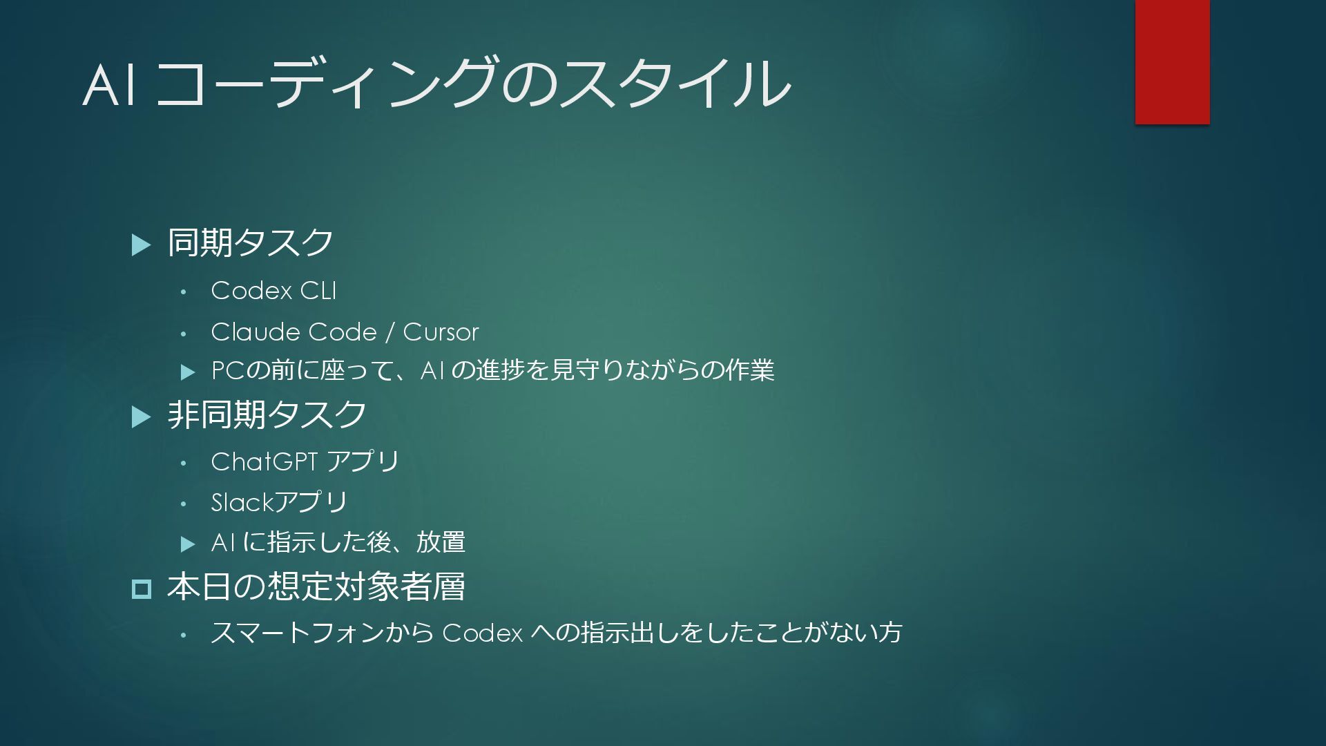 / Cursor PCの前に座って、AI の進捗を見守りながらの作業 非同期タスク • ChatGPT アプリ • Slackアプリ AI に指示した後、放置 本日の想定対象者層 • スマートフォンから Codex への指示出しをしたことがない方