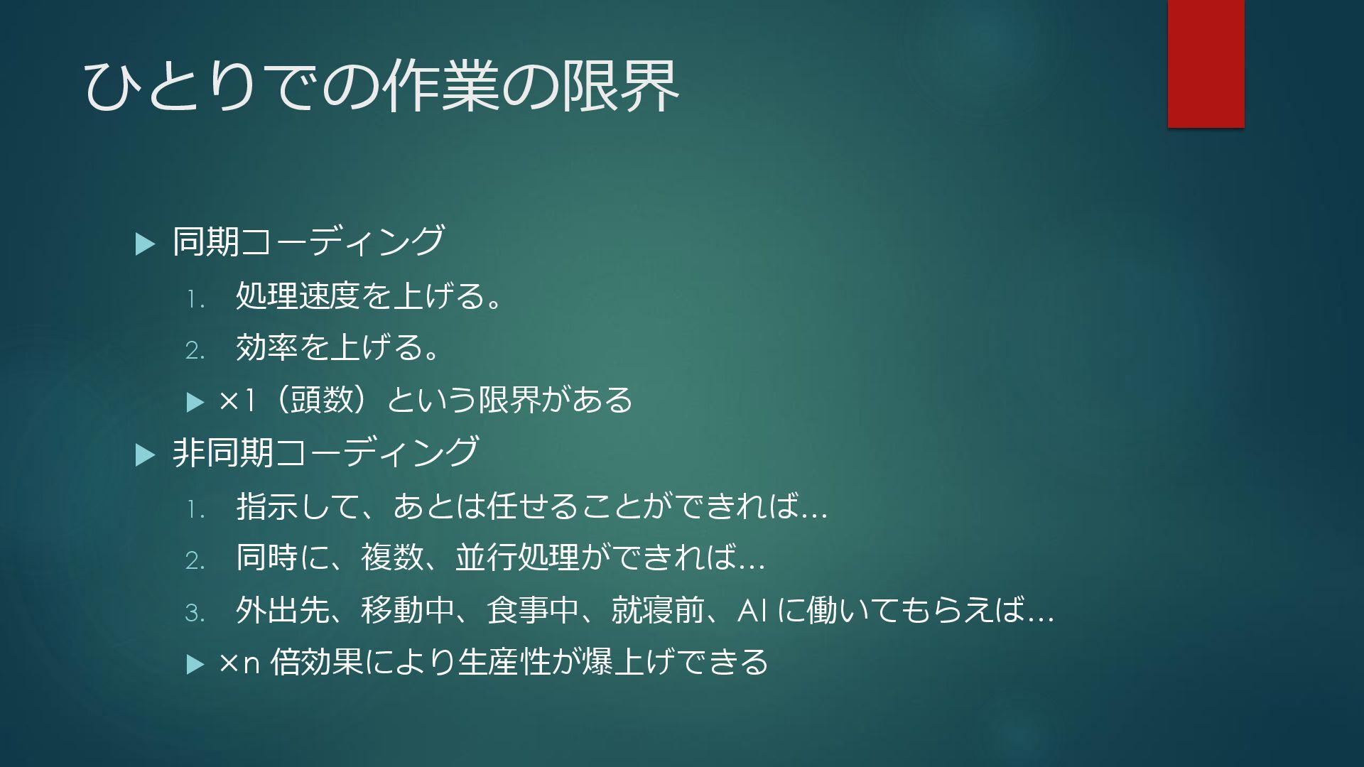 非同期コーディング 1. 指示して、あとは任せることができれば… 2. 同時に、複数、並行処理ができれば… 3. 外出先、移動中、食事中、就寝前、AI に働いてもらえば… ×n 倍効果により生産性が爆上げできる