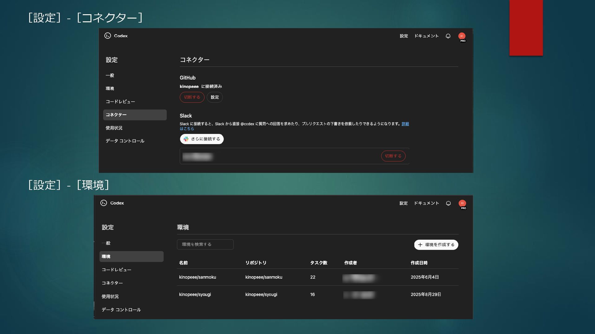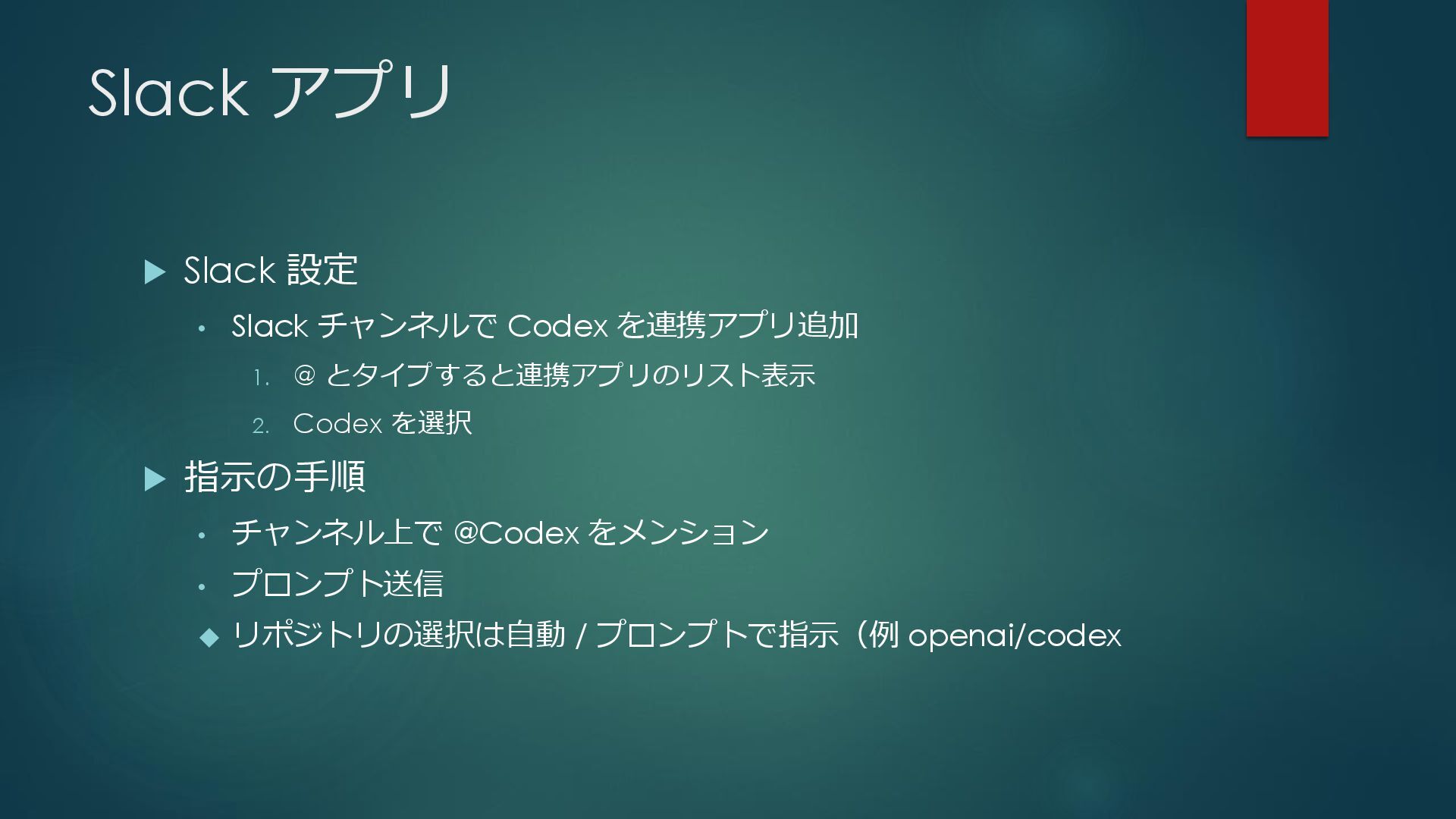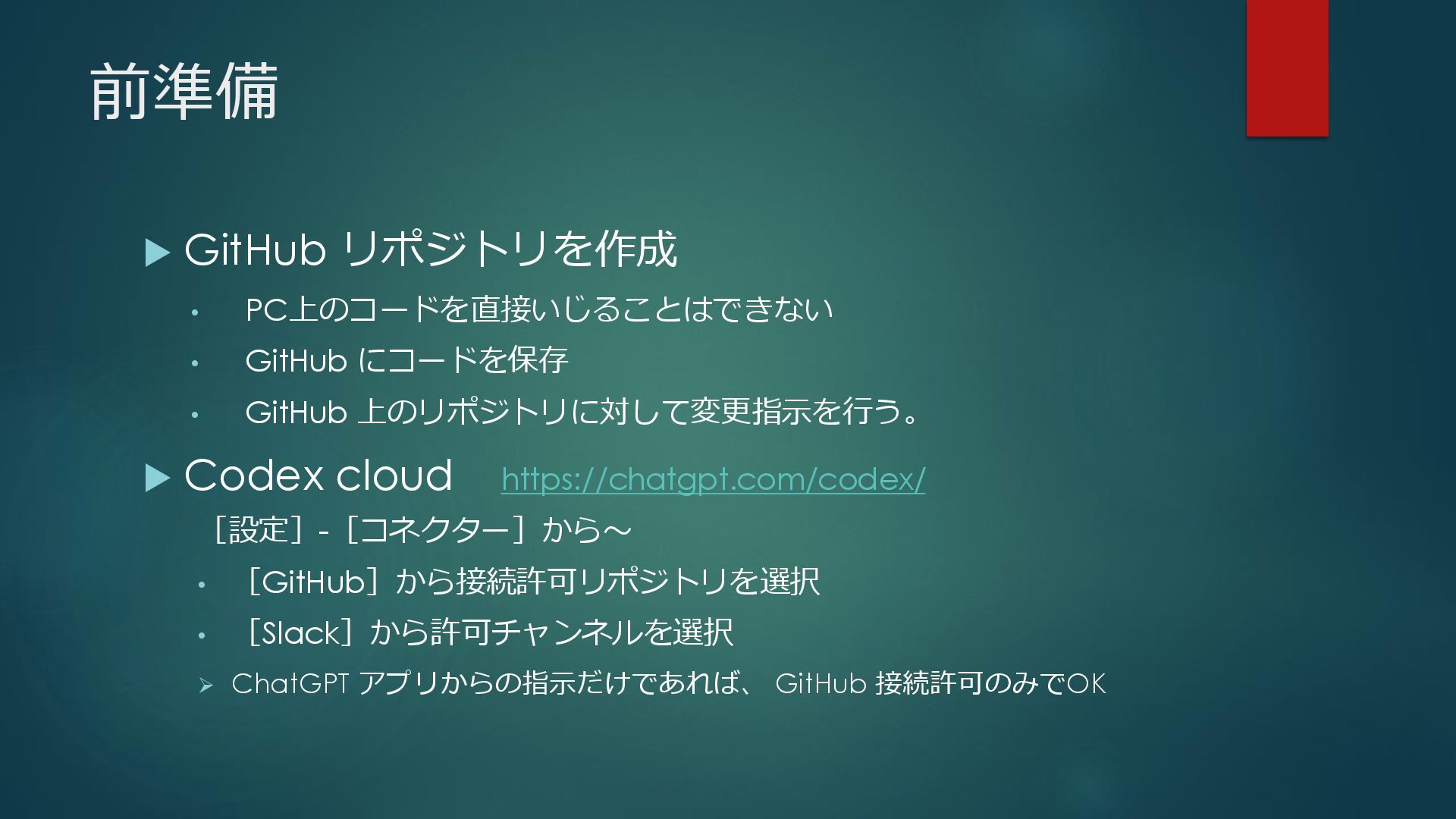 GitHub 上のリポジトリに対して変更指示を行う。 Codex cloud https://chatgpt.com/codex/ [設定]-[コネクター]から〜 • [GitHub]から接続許可リポジトリを選択 • [Slack]から許可チャンネルを選択 ➢ ChatGPT アプリからの指示だけであれば、 GitHub 接続許可のみでOK