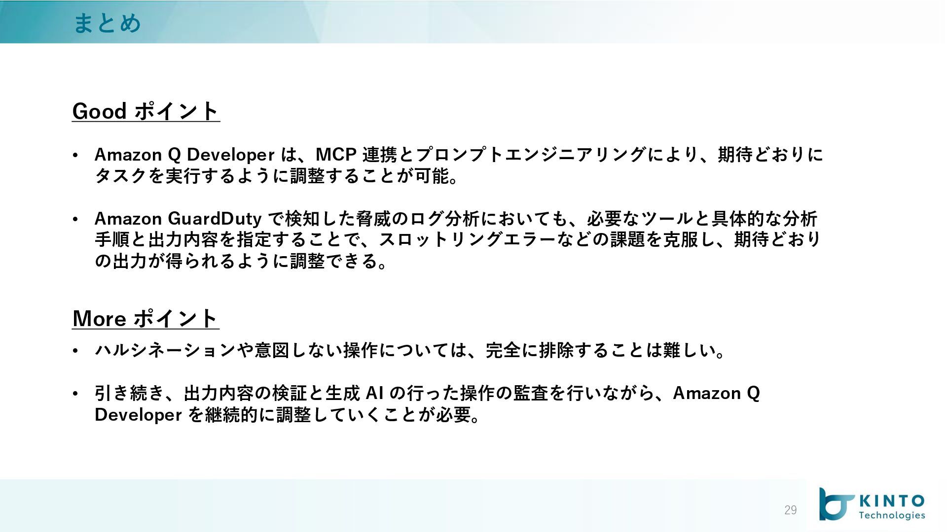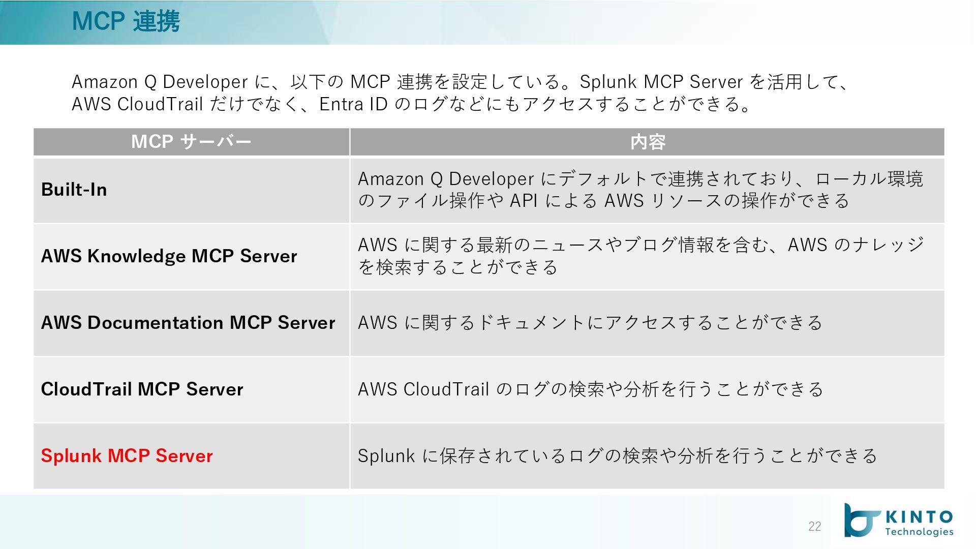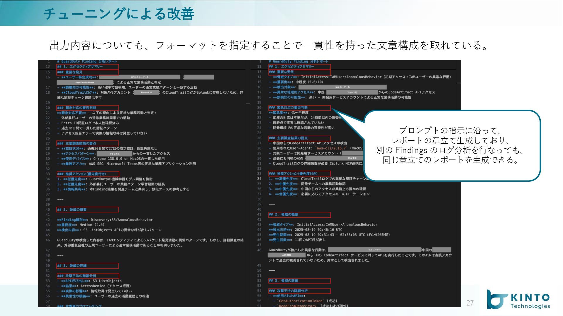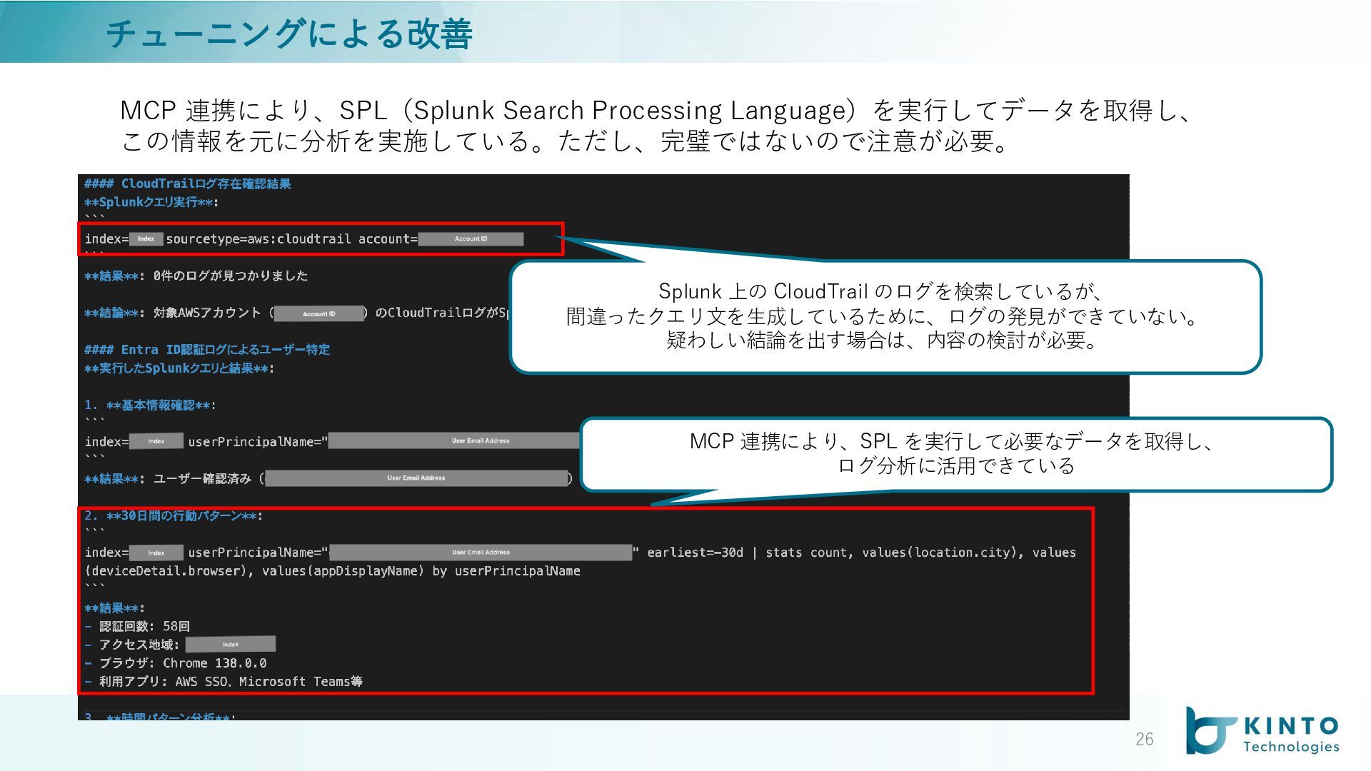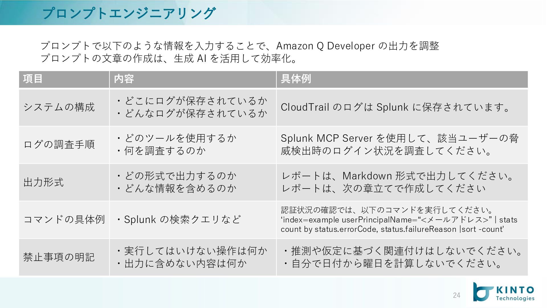 内容 具体例 システムの構成 ・どこにログが保存されているか ・どんなログが保存されているか CloudTrail のログは Splunk に保存されています。 ログの調査手順 ・どのツールを使用するか ・何を調査するのか Splunk MCP Server を使用して、該当ユーザーの脅 威検出時のログイン状況を調査してください。 出力形式 ・どの形式で出力するのか ・どんな情報を含めるのか レポートは、Markdown 形式で出力してください。 レポートは、次の章立てで作成してください コマンドの具体例 ・Splunk の検索クエリなど 認証状況の確認では、以下のコマンドを実行してください。 ‘index=example userPrincipalName=“<メールアドレス>” | stats count by status.errorCode, status.failureReason |sort -count' 禁止事項の明記 ・実行してはいけない操作は何か ・出力に含めない内容は何か ・推測や仮定に基づく関連付けはしないでください。 ・自分で日付から曜日を計算しないでください。